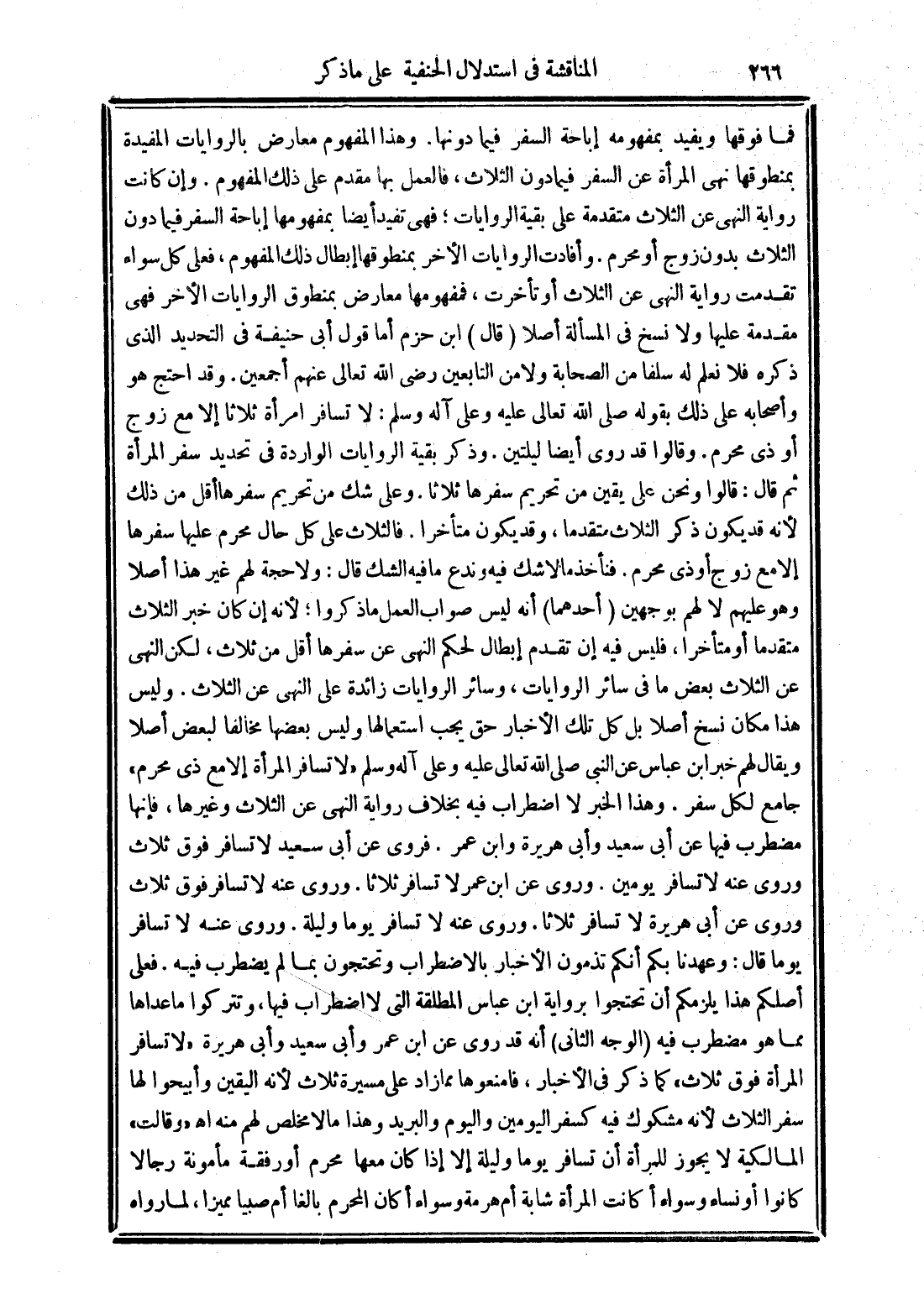 فما فوقها ويفيد بمفهومه إباحة السفر فيما دونها. وهذا المفهوم معارض بالروايات المفيدة بمنطوقها نهى المرأة عن السفر فيما دون الثلاث، فالعمل بها مقدم على ذلك المفهوم. وإن كانت رواية النهى عن الثلاث متقدمة على بقية الروايات؛ فهى تفيد أيضا بمفهومها إباحة السفر فيما دون الثلاث بدون زوج أو محرم. وأفادت الروايات الأخر بمنطوقها إبطال ذلك المفهوم، فعلى كل سواء تقدمت رواية النهى عن الثلاث أو تأخرت، فمفهومها معارض بمنطوق الروايات الأخر فهى مقدمة عليها ولا نسخ فى المسألة أصلا (قال) ابن حزم أما قول أبى حنيفة في التحديد الذى ذكره فلا نعلم له سلفا من الصحابة ولا من التابعين رضى الله تعالى عنهم أجمعين. وقد احتج هو وأصحابه على ذلك بقوله صلى الله تعالى عليه وعلى آله وسلم: لا تسافر امرأة ثلاثا إلا مع زوج أو ذى محرم. وقالوا قد روى أيضا ليلتين. وذكر بقية الروايات الواردة في تحديد سفر المرأة ثم قال: قالوا ونحن على يقين من تحريم سفرها ثلاثا. وعلى شك من تحريم سفرها أقل من ذلك لأنه قد يكون ذكر الثلاث متقدما، وقد يكون متأخرا. فالثلاث على كل حال محرم عليها سفرها إلا مع زوج أو ذى محرم. فنأخذ ما لا شك فيه وندع ما فيه الشك قال: ولا حجة لهم غير هذا أصلا وهو عليهم لا لهم بوجهين (أحدهما) أنه ليس صواب العمل ما ذكروا؛ لأنه إن كان خبر الثلاث متقدما أو متأخرا، فليس فيه إن تقدم إبطال لحكم النهى عن سفرها أقل من ثلاث، لكن النهى عن الثلاث بعض ما فى سائر الروايات، وسائر الروايات زائدة على النهى عن الثلاث. وليس هذا مكان نسخ أصلا بل كل تلك الأخبار حق يجب استعمالها وليس بعضها مخالفا لبعض أصلا ويقال لهم خبر ابن عباس عن النبى صلى الله تعالى عليه وعلى آله وسلم "لا تسافر المرأة إلا مع ذى محرم" جامع لكل سفر. وهذا الخبر لا اضطراب فيه بخلاف رواية النهى عن الثلاث وغيرها، فإنها مضطرب فيها عن أبى سعيد وأبى هريرة وابن عمر. فروى عن أبى سعيد لا تسافر فوق ثلاث وروى عنه لا تسافر يومين. وروى عن ابن عمر لا تسافر ثلاثا. وروى عنه لا تسافر فوق ثلاث وروى عن أبى هريرة لا تسافر ثلاثا. وروى عنه لا تسافر يوما وليلة. وروى عنه لا تسافر يوما قال: وعهدنا بكم أنكم تذمون الأخبار بالاضطراب وتحتجون بما لم يضطرب فيه. فعلى أصلكم هذا يلزمكم أن تحتجوا برواية ابن عباس المطلقة التى لا اضطراب فيها، وتتركوا ما عداها مما هو مضطرب فيه (الوجه الثانى) أنه قد روى عن ابن عمر وأبى سعيد وأبى هريرة "لا تسافر المرأة فوق ثلاث" كما ذكر فى الأخبار، فامنعوها مما زاد على مسيرة ثلاث لأنه اليقين وأبيحوا لها سفر الثلاث لأنه مشكوك فيه كسفر اليومين واليوم والبريد وهذا ما لا مخلص لهم منه اهـ "وقالت" المالكية لا يجوز للمرأة أن تسافر يوما وليلة إلا إذا كان معها محرم أو رفقة مأمونة رجالا كانوا أو نساء وسواء أكانت المرأة شابة أم هرمة وسواء أكان المحرم بالغا أم صبيا مميزا، لما رواه