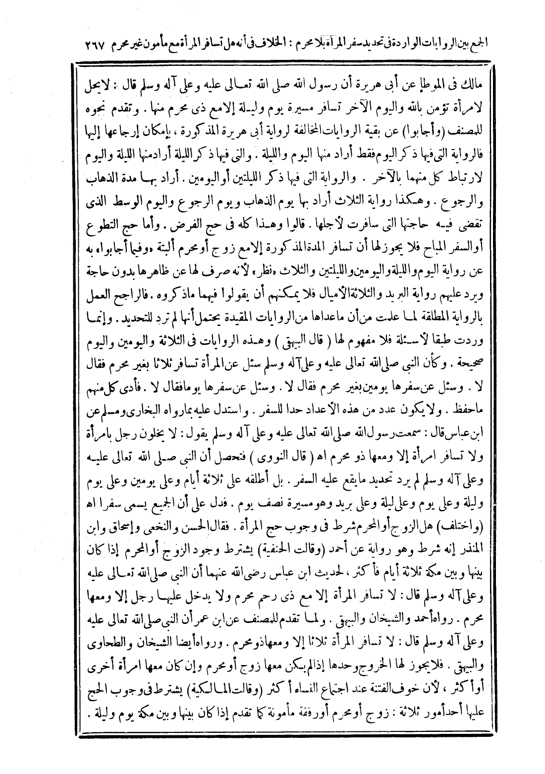 مالك فى الموطإ عن أبى هريرة أن رسول الله صلى الله تعالى عليه وعلى آله وسلم قال: لا يحل لامرأة تؤمن بالله واليوم والآخر تسافر مسيرة يوم وليلة إلا مع ذى محرم منها. وتقدم نحوه للمصنف (وأجابوا) عن بقية الروايات المخالفة لرواية أبى هريرة المذكورة، بإمكان إرجاعها إليها فالرواية التى فيها ذكر اليوم فقط أراد منها اليوم والليلة. والتى فيها ذكر الليلة أراد منها الليلة واليوم لارتباط كل منهما بالآخر. والرواية التى فيها ذكر الليلتين أو اليومين. أراد بها مدة الذهاب والرجوع. وهكذا رواية الثلاث أراد بها يوم الذهاب ويوم الرجوع واليوم الوسط الذى تقضى فيه حاجتها التى سافرت لأجلها. قالوا وهذا كله فى حج الفرض. وأما حج التطوع أو السفر المباح فلا يجوز لها أن تسافر المدة المذكورة إلا مع زوج أو محرم ألبتة "وفيما أجابوا" به عن رواية اليوم والليلة واليومين والليلتين والثلاث "نظر" لأنه صرف لها عن ظاهرها بدون حاجة ويرد عليهم رواية البريد والثلاثة الأميال فلا يمكنهم أن يقولوا فيهما ما ذكروه. فالراجح العمل بالرواية المطلقة لما علمت من أن ما عداها من الروايات المقيدة يحتمل أنها لم ترد للتحديد. وإنما وردت طبقا لأسئلة فلا مفهوم لها (قال البيهقى) وهذه الروايات في الثلاثة واليومين واليوم صحيحة. وكأن النبى صلى الله تعالى عليه وعلى آله وسلم سئل عن المرأة تسافر ثلاثا بغير محرم فقال لا. وسئل عن سفرها يومين بغير محرم فقال لا. وسئل عن سفرها يوما فقال لا. فأدى كل منهم ما حفظ. ولا يكون عدد من هذه الأعداد حدا للسفر. واستدل عليه بما رواه البخارى ومسلم عن ابن عباس قال: سمعت رسول الله صلى الله تعالى عليه وعلى آله وسلم يقول: لا يخلون رجل بامرأة ولا تسافر امرأة إلا ومعها ذو محرم اهـ (قال النووى) فتحصل أن النبى صلى الله تعالى عليه وعلى آله وسلم لم يرد تحديد ما يقع عليه السفر. بل أطلقه على ثلاثة أيام وعلى يومين وعلى يوم وليلة وعلى يوم وعلى بريد وهو مسيرة نصف يوم. فدل على أن الجميع يسمى سفرا اهـ (واختلف) هل الزوج أو المحرم شرط فى وجوب حج المرأة. فقال الحسن والنخعى وإسحاق وابن المنذر إنه شرط وهو رواية عن أحمد (وقالت الحنفية) يشترط وجود الزوج أو المحرم إذا كان بينها وبين مكة ثلاثة أيام فأكثر، لحديث ابن عباس رضى الله عنهما أن النبى صلى الله تعالى عليه وعلى آله وسلم قال: لا تسافر المرأة إلا مع ذى رحم محرم ولا يدخل عليها رجل إلا ومعها محرم. رواه أحمد والشيخان والبيهقى. ولما تقدم للمصنف عن ابن عمر أن النبى صلى الله تعالى عليه وعلى آله وسلم قال: لا تسافر المرأة ثلاثا إلا ومعها ذو محرم. ورواه أيضا الشيخان والطحاوى والبيهقى. فلا يجوز لها الخروج وحدها إذا لم يكن معها زوج أو محرم وإن كان معها امرأة أخرى أو أكثر، لأن خوف الفتنة عند اجتماع النساء أكثر (وقالت المالكية) يشترط فى وجوب الحج عليها أحد أمور ثلاثة: زوج أو محرم أو رفقة مأمونة كما تقدم إذا كان بينها وبين مكة يوم وليلة.