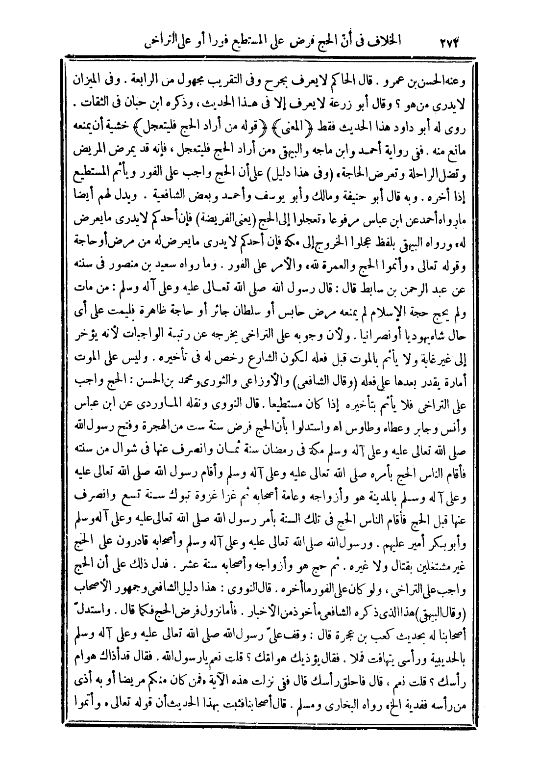 (قوله من أراد الحج فليتعجل) خشية أن يمنعه مانع منه. ففى رواية أحمد وابن ماجه والبيهقى "من أراد الحج فليتعجل، فإنه قد يمرض المريض وتضل الراحلة وتعرض الحاجة" (وفى هذا دليل) على أن الحج واجب على الفور ويأثم المستطيع إذا أخره. وبه قال أبو حنيفة ومالك وأبو يوسف وأحمد وبعض الشافعية. ويدل لهم أيضا ما رواه أحمد عن ابن عباس مرفوعا "تعجلوا إلى الحج (يعنى الفريضة) فإن أحدكم لا يدرى ما يعرض له" ورواه البيهقى بلفظ عجلوا الخروج إلى مكة فإن أحدكم لا يدرى ما يعرض له مرض أو حاجة وقوله تعالى {وَأَتِمُّوا الْحَجَّ وَالْعُمْرَةَ لِلَّهِ} والأمر على الفور. وما رواه سعيد بن منصور فى سننه عن عبد الرحمن بن سابط قال: قال رسول الله صلى الله تعالى عليه وعلى آله وسلم: من مات ولم يحج حجة الإسلام لم يمنعه مرض حابس أو سلطان جائر أو حاجة ظاهرة فليمت على أى حال شاء يهوديا أو نصرانيا. ولأن وجوبه على التراخى يخرجه عن رتبة الواجبات لأنه يؤخر إلى غير غاية ولا يأثم بالموت قبل فعله لكون الشارع رخص له فى تأخيره. وليس على الموت أمارة يقدر بعدها على فعله (وقال الشافعى) والأوزاعى والثورى ومحمد بن الحسن: الحج واجب على التراخى فلا يأثم بتأخيره إذا كان مستطيعا. قال النووى ونقله الماوردى عن ابن عباس وأنس وجابر وعطاء وطاوس اهـ واستدلوا بأن الحج فرض سنة ست من الهجرة وفتح رسول الله صلى الله تعالى عليه وعلى آله وسلم مكة فى رمضان سنة ثمان وانصرف عنها فى شوال من سنته فأقام الناس الحج بأمره صلى الله تعالى عليه وعلى آله وسلم وأقام رسول الله صلى الله تعالى عليه وعلى آله وسلم بالمدينة هو وأزواجه وعامة أصحابه ثم غزا غزوة تبوك سنة تسع وانصرف عنها قبل الحج فأقام الناس الحج فى تلك السنة بأمر رسول الله صلى الله تعالى عليه وعلى آله وسلم وأبو بكر أمير عليهم. ورسول الله صلى الله تعالى عليه وعلى آله وسلم وأصحابه قادرون على الحج غير مشتغلين بقتال ولا غيره. ثم حج هو وأزواجه وأصحابه سنة عشر. فدل ذلك على أنّ الحج واجب على التراخى، ولو كان على الفور ما أخره. قال النووى: هذا دليل الشافعى وجمهور الأصحاب (وقال البيهقى) هذا الذى ذكره الشافعى مأخوذ من الأخبار. فأما نزول فرض الحج فكما قال. واستدلّ أصحابنا له بحديث كعب بن عجرة قال: وقف علىّ رسول الله صلى الله تعالى عليه وعلى آله وسلم بالحديبية ورأسى يتهافت قملا. فقال يؤذيك هوامّك؟ قلت نعم يا رسول الله. فقال قد أذاك هوام رأسك؟ قلت نعم، قال فاحلق رأسك قال ففى نزلت هذه الآية "فمن كان منكم مريضا أو به أذى من رأسه ففدية الخ" رواه البخارى ومسلم. قال أصحابنا فثبت بهذا الحديث أن قوله تعالى {وَأَتِمُّوا