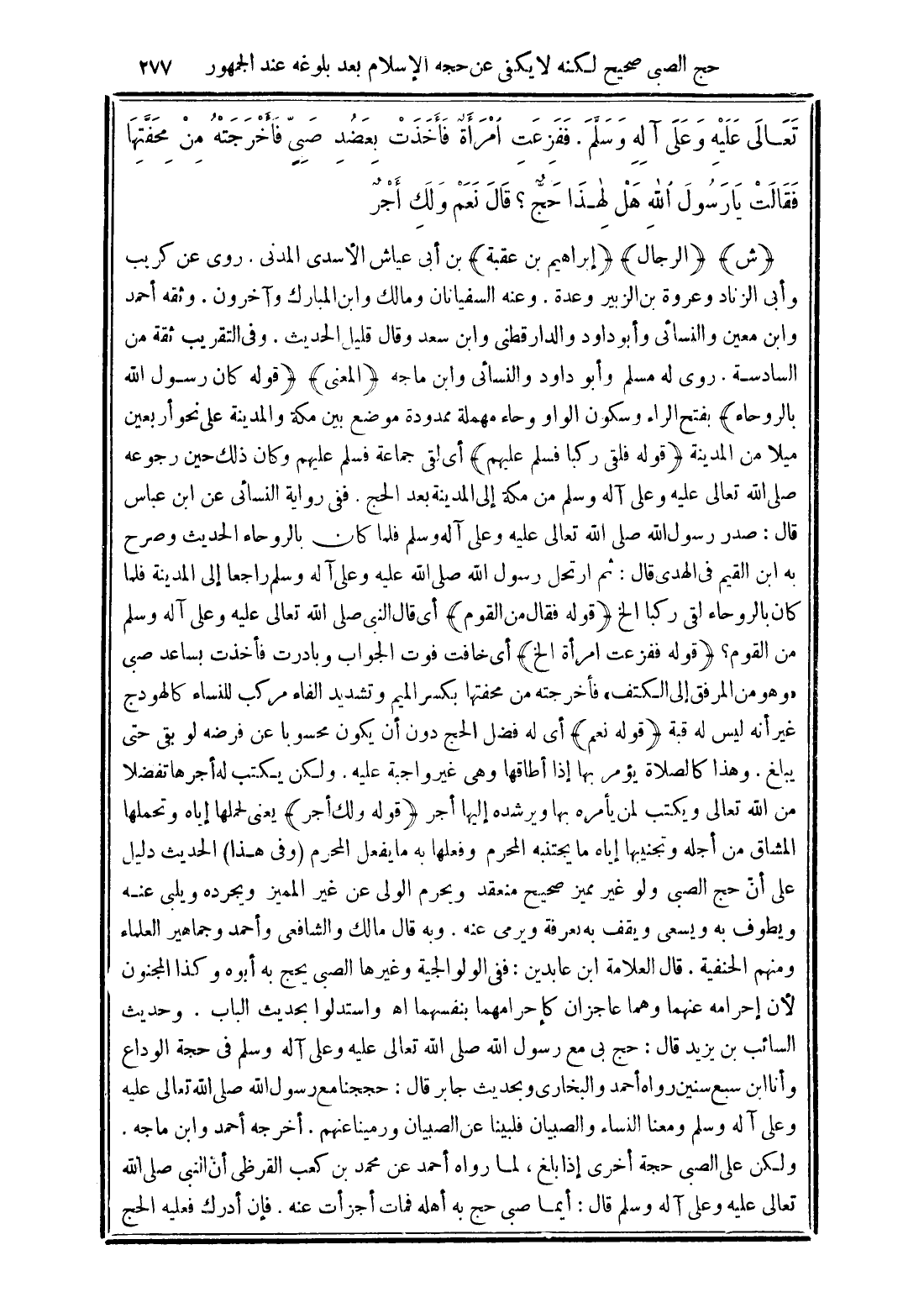 (قوله ولك أجر) يعني لحملها إياه وتحملها المشاق من أجله وتجنيبها إياه ما يجتنبه المحرم وفعلها به ما يفعل المحرم (وفي هذا) الحديث دليل على أنّ حج الصبي ولو غير مميز صحيح منعقد ويحرم الولى عن غير المميز ويجرده ويلبي عنه ويطوف به ويسعى ويقف به بعرفة ويرمي عنه. وبه قال مالك والشافعي وأحمد وجماهير العلماء ومنهم الحنفية. قال العلامة بن عابدين: ففي الولو الجية وغيرها الصبي يحج به أبوه وكذا المجنون لأن إحرامه عنهما وهما عاجزان كإحرامهما بنفسهما اهـ واستدلوا بحديث الباب. وحديث السائب بن يزيد قال: حج بي مع رسول الله صلى الله تعالى عليه وعلى آله وسلم في حجة الوداع وأنا ابن سبع سنين رواه أحمد والبخاري وبحديث جابر قال: حججنا مع رسول الله صلى الله تعالى عليه وعلى آله وسلم ومعنا النساء والصبيان فلبينا عن الصبيان ورمينا عنهم. أخرجه أحمد وابن ماجه. ولكن على الصبي حجة أخرى إذا بلغ، لما رواه أحمد عن محمد بن كعب القرظي أن النبي صلى الله تعالى عليه وعلى آله وسلم قال: أيما صبي حج به أهله فمات أجزأت عنه. فإن أدرك فعليه الحج