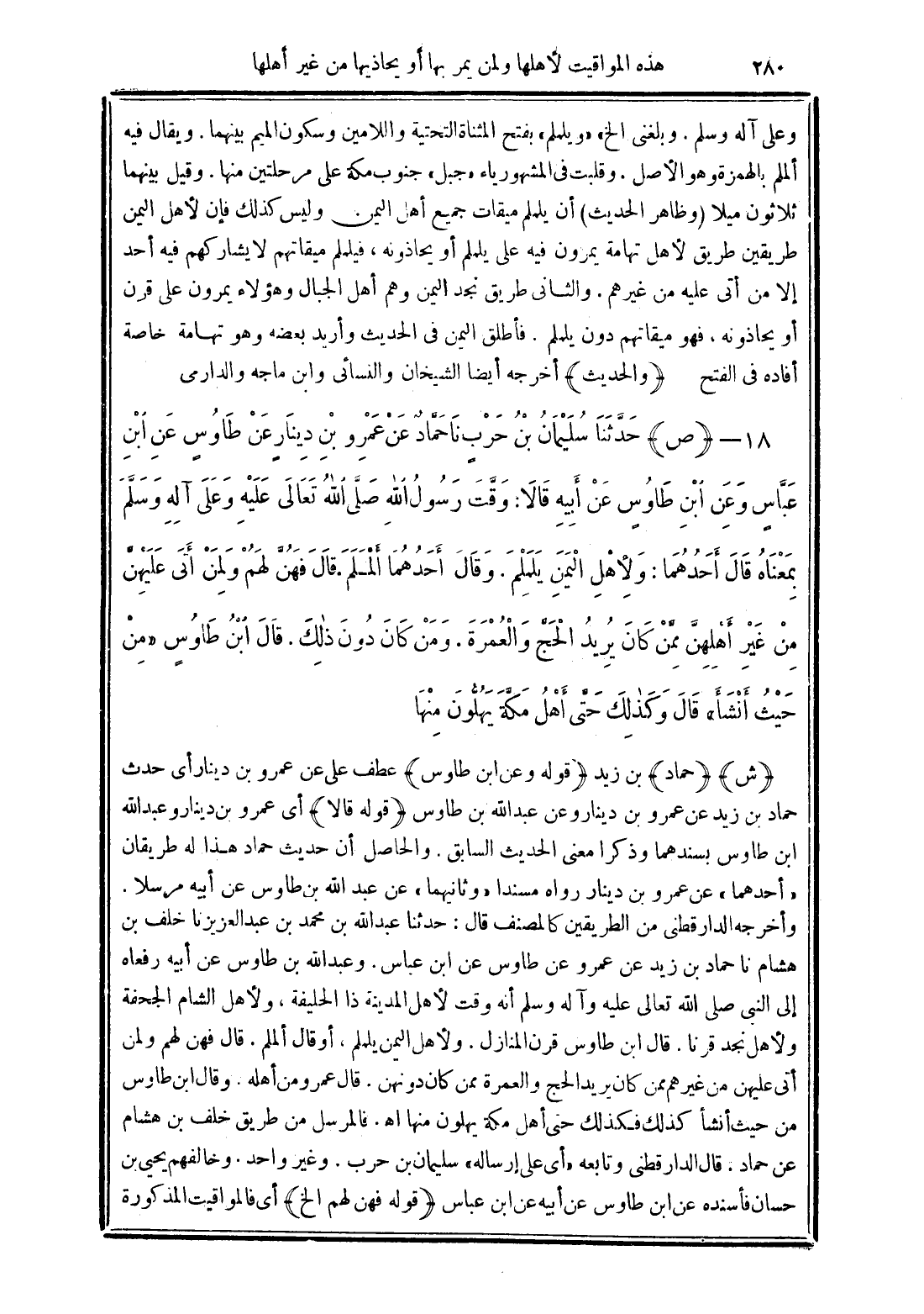 18 - (ص) حَدَّثَنَا سُلَيْمَانُ بْنُ حَرْبٍ نَا حَمَّادٌ عَنْ عَمْرِو بْنِ دِينَارٍ عَنْ طَاوُسٍ عَنِ ابْنِ عَبَّاسٍ وَعَنِ ابْنِ طَاوُسٍ عَنْ أَبِيهِ قَالاَ: وَقَّتَ رَسُولُ اللَّهِ صَلَّى اللَّهُ تَعَالَى عَلَيْهِ وَعَلَى آلِهِ وَسَلَّمَ بِمَعْنَاهُ قَالَ أَحَدُهُمَا: وَلأَهْلِ الْيَمَنِ يَلَمْلَمَ. وَقَالَ أَحَدُهُمَا أَلَمْلَمَ. قَالَ فَهُنَّ لَهُمْ وَلِمَنْ أَتَى عَلَيْهِنَّ مِنْ غَيْرِ أَهْلِهِنَّ مِمَّنْ كَانَ يُرِيدُ الْحَجَّ وَالْعُمْرَةَ. وَمَنْ كَانَ دُونَ ذَلِكَ. قَالَ ابْنُ طَاوُسٍ "مِنْ حَيْثُ أَنْشَأَ" قَالَ وَكَذَلِكَ حَتَّى أَهْلُ مَكَّةَ يُهِلُّونَ مِنْهَا.