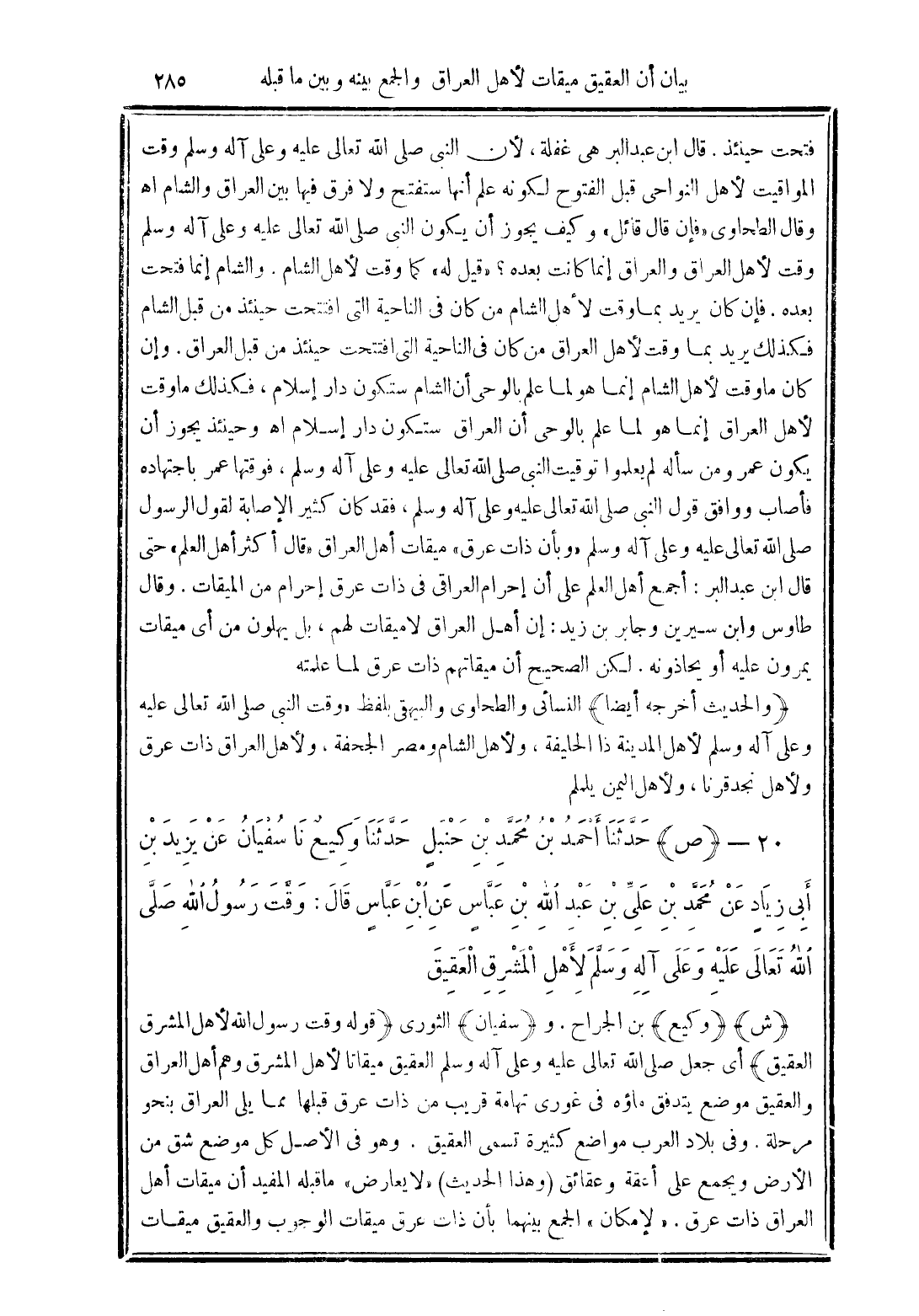 20 - (ص) حَدَّثَنَا أَحْمَدُ بْنُ مُحَمَّدِ بْنِ حَنْبَلٍ حَدَّثَنَا وَكِيعٌ نَا سُفْيَانُ عَنْ يَزِيدَ بْنِ أَبِى زِيَادٍ عَنْ مُحَمَّدِ بْنِ عَلِىِّ بْنِ عَبْدِ اللَّهِ بْنِ عَبَّاسٍ عَنِ ابْنِ عَبَّاسٍ قَالَ: وَقَّتَ رَسُولُ اللَّهِ صَلَّى اللَّهُ تَعَالَى عَلَيْهِ وَعَلَى آلِهِ وَسَلَّمَ لِأَهْلِ الْمَشْرِقِ الْعَقِيقَ.