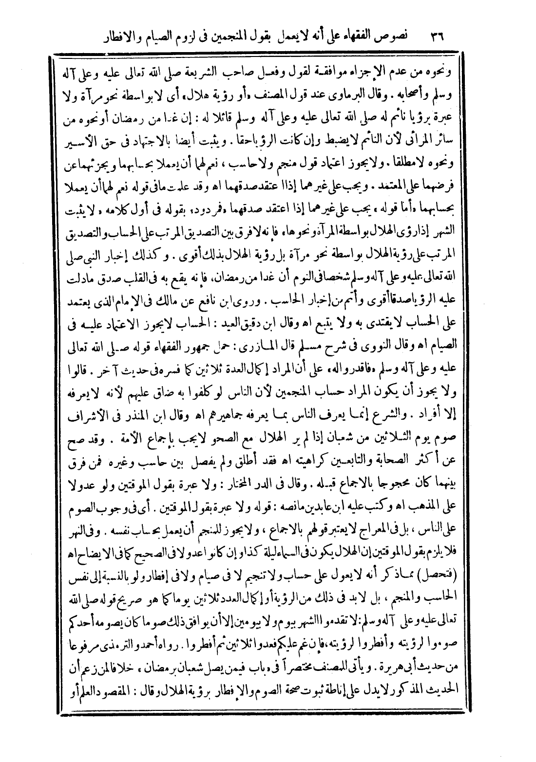 نحوه من عدم الإجزاء موافقة لقول وفعل وصاحب الشريعة صلى الله تعالى عليه وعلى آله وسلم وأصحابه. وقال البرماوى عند قول المصنف "أو رؤية هلال" أى لا بواسطة نحو مرآة ولا عبرة برؤيا نائم له صلى الله تعالى عليه وعلى آله وسلم قائلًا له: إن غدا من رمضان أو نحوه من سائر المرائى لأن النائم لا يضبط وإن كانت الرؤيا حقا. ويثبت أيضًا بالاجتهاد فى حق الأسير ونحوه لا مطلقا. ولا يجوز اعتماد قول منجم ولا حاسب، نعم لهما أن يعملا بحسابهما ويجزئهما عن فرضهما على المعتمد. ويجب علي غيرهما إذا اعتقد صدقهما اهـ وقد علمت ما فى قوله نعم لهما أن يعملا بحسابهما "أما قوله" ويجب على غيرهما إذا اعتقد صدقهما "فمردوده" بقوله فى أول كلامه "لا يثبت الشهر إذا رؤى الهلال بواسطة المرآة ونحوها" فإنه لا فرق بين التصديق المرتب على الحساب والتصديق المرتب على رؤية الهلال بواسطة نحو مرآة بل رؤية الهلال بذك أقوى. وكذلك إخبار النبى صلى الله تعالى عليه وعلى آله وسلم شخصا فى النوم أن غدا من رمضان, فإنه يقع فى القلب صدق ما دلت عليه الرؤيا صدقًا أقوى وأتم من إخبار الحاسب. وروى ابن نافع عن مالك فى الإمام الذى يعتمد علي الحساب لا يقتدى به ولا يتبع اهـ وقال ابن دقيق العيد: الحساب لا يجوز الاعتماد عليه فى الصيام اهـ وقال النووى فى شرح مسلم قال المازرى: حمل جمهور الفقهاء قوله صلى الله تعالى عليه وعلى آله وسلم "فاقدروا له" على أن المراد إكمال العدة ثلاثين كما فسره فى حديث آخر. قالوا ولا يجوز أن يكون المراد حساب المنجمين لأن الناس لو كلفوا به ضاق عليهم لأنه لا يعرفه إلا أفراد. والشرع إنما يعرف الناس بما يعرفه جماهيرهم اهـ وقال ابن المنذر فى الأشراف صوم يوم الثلاثين من شعبان إذا لم ير الهلال مع الصحو لا يجب بإجماع الأمة. وقد صح عن أكثر الصحابة والتابعين كراهيته اهـ فقد أطلق ولم يفصل بين حاسب وغيره فمن فرق بينهما كان محجوجًا بالاجماع قبله. وقال فى الدر المختار: ولا عبرة بقول الموقتين ولو عدولا علي المذهب اهـ وكتب عليه ابن عابدين ما نصه: قوله ولا عبرة بقول الموقتين. أى فى وجوب الصوم على الناس، بل فى المعراج لا يعتبر قولهم بالاجماع، ولا يجوز للمنجم أن يعمل بحساب نفسه. وفى النهر فلا يلزم بقول الموقتين إن الهلال يكون فى السماء ليلة كذا وإن كانوا عدولا فى الصحيح كما فى الايضاح اهـ (فتحصل) مما ذكر أنه لا يعول على حساب ولا تنجيم لا فى صيام ولا فى إفطار ولو بالنسبة إلى نفس الحاسب والمنجم، بل لا بد فى ذلك من الرؤية أو إكمال العدد ثلاثين يوما كما هو صريح قوله صلى الله تعالى عليه وعلى آله وسلم: لا تقدموا الشهر بيوم ولا بيومين إلا أن يوافق ذلك صوما كان يصومه أحدكم صوموا لرؤيته وأفطروا لرؤيته، فإن غم عليكم فعدوا ثلاثين ثم أفطروا. رواه أحمد والترمذى مرفوعًا من حديث أبى هريرة. ويأتى للمصنف مختصرًا في "باب فيمن يصل شعبان برمضان" خلافًا لمن زعم أن الحديث المذكور لا يدل على إناطة ثبوت صحة الصوم والإفطار برؤية الهلال وقال: المقصود العلم أو