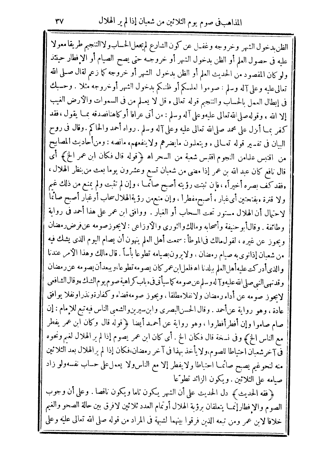الظن بدخول الشهر وخروجه وغفل عن كون الشارع لم يجعل الحساب ولا التنجيم طريقا معولا عليه فى حصول العلم أو الظن بدخول الشهر أو خروجه حتى يصح الصيام أو الإفطار حينئذ ولو كان المقصود من الحديث العلم أو الظن بدخول الشهر أو خروجه كما زعم لقال صلى الله تعالى عليه وعلى آله وسلم: صوموا لعلمكم أو ظنكم بدخول الشهر أو خروجه مثلا. وحسبك فى إبطال العمل بالحساب والتنجيم قوله تعالى {قُلْ لَا يَعْلَمُ مَنْ فِي السَّمَاوَاتِ وَالْأَرْضِ الْغَيْبَ إِلَّا اللَّهُ} وقوله صلى الله تعالى عليه وعلى آله وسلم: من أتى عرافا أو كاهنا فصدقه بما يقول , فقد كفر بما أنزل على محمد صلى الله تعالى عليه وعلى آله وسلم. رواه أحمد والحاكم. وقال فى روح البيان فى تفسير قوله تعالى {وَيَتَعَلَّمُونَ مَا يَضُرُّهُمْ وَلَا يَنْفَعُهُمْ} ما نصه: ومن أحاديث المصابيح من اقتبس علما من النجوم اقتبس شعبة من السحر اهـ