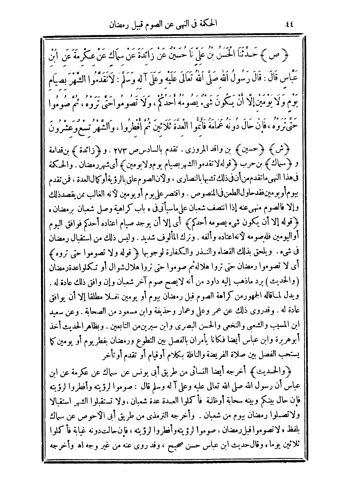 (ص) حَدَّثَنَا الْحَسَنُ بْنُ عَلِىٍّ نَا حُسَيْنٌ عَنْ زَائِدَةَ عَنْ سِمَاكٍ عَنْ عِكْرِمَةَ عَنِ ابْنِ عَبَّاسٍ قَالَ: قَالَ رَسُولُ اللَّهِ صَلَّى اللَّهُ تَعَالَى عَلَيْهِ وَعَلَى آلِهِ وَسَلَّمَ: لاَ تُقَدِّمُوا الشَّهْرَ بِصِيَامِ يَوْمٍ وَلاَ يَوْمَيْنِ إِلاَّ أَنْ يَكُونَ شَىْءٌ يَصُومُهُ أَحَدُكُمْ, وَلاَ تَصُومُوا حَتَّى تَرَوْهُ, ثُمَّ صُومُوا حَتَّى تَرَوْهُ, فَإِنْ حَالَ دُونَهُ غَمَامَةٌ فَأَتِمُّوا الْعِدَّةَ ثَلاَثِينَ ثُمَّ أَفْطِرُوا, وَالشَّهْرُ تِسْعٌ وَعِشْرُونَ.