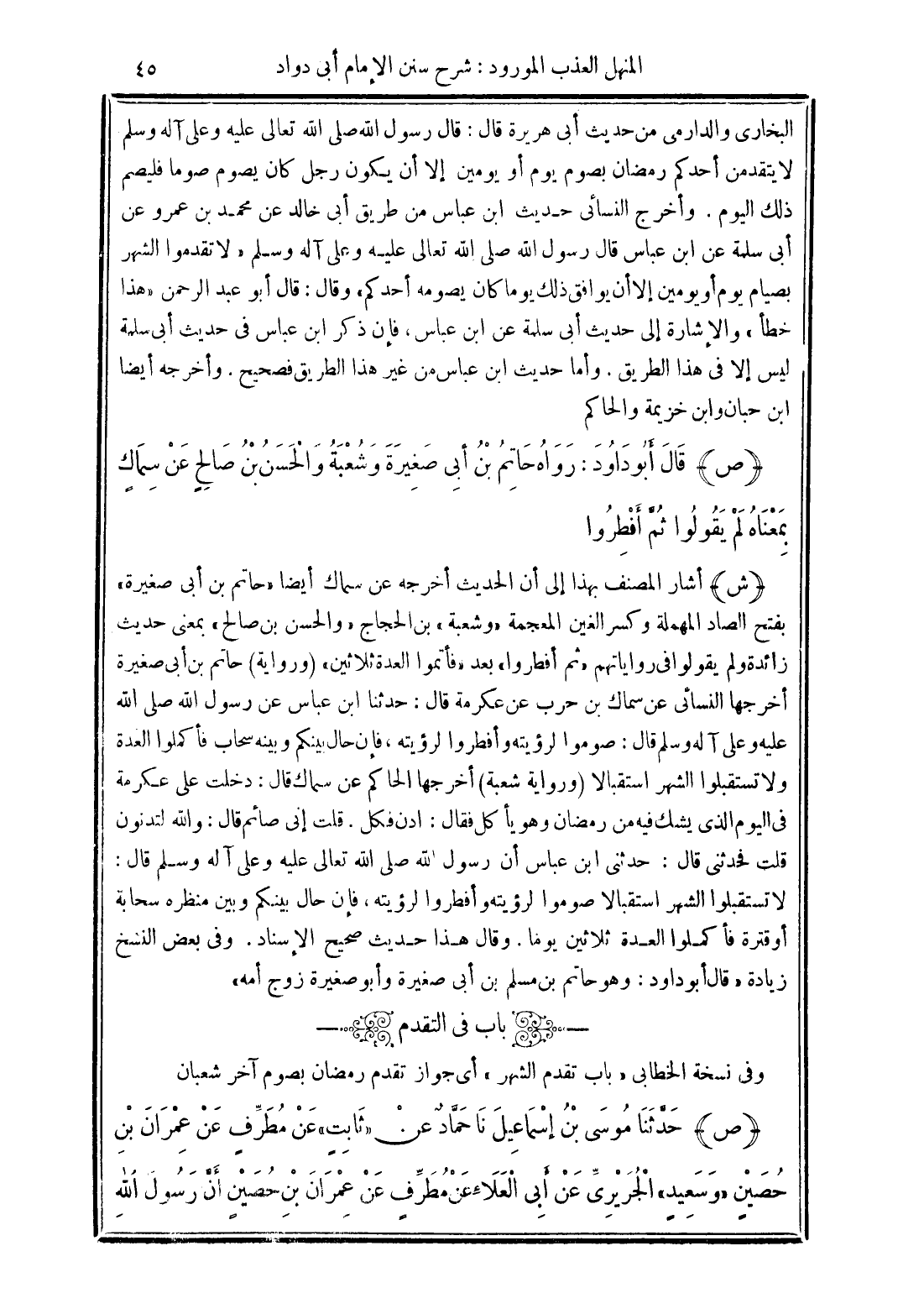 (ش) أشار المصنف بهذا إلى أن الحديث أخرجه عن سماك أيضا "حاتم بن أبى صغيرة" بفتح الصاد المهملة وكسر الغين المعجمة "وشعبة" بن الحجاج "والحسن بن صالح" بمعنى حديث زائدة ولم يقولوا فى رواياتهم "ثم أفطروا" بعد "فاتموا العدة ثلاثين" (ورواية) حاتم بن أبى صغيرة أخرجها النسائى عن سماك بن حرب عن عكرمة قال: حدثنا ابن عباس عن رسول الله صلى الله عليه وعلى آله وسلم قال: صوموا لرؤيته وأفطروا لرؤيته، فإن حال بينكم وبينه سحاب فأكملوا العدة ولا تستقبلوا الشهر استقبالا (ورواية شعبة) أخرجها الحاكم عن سماك قال: دخلت علي عكرمة فى اليوم الذى يشك فيه من رمضان وهو يأكل فقال: ادن فكل. قلت إني صائم قال: والله لتدنون قلت فحدثنى قال: حدثنى ابن عباس أن رسول الله صلى الله تعالى عليه وعلى آله وسلم قال: لا تستقبلوا الشهر استقبالا صوموا لرؤيته وأفطروا لرؤيته، فإن حال بينكم وبين منظره سحابة أو قترة فأكملوا العدة ثلاثين يوما. وقال هذا حديث صحيح الإسناد. وفى بعض النسخ زيادة "قال أبو داود: وهو حاتم بن مسلم بن أبى صغيرة وأبو صغيرة زوج أمه"