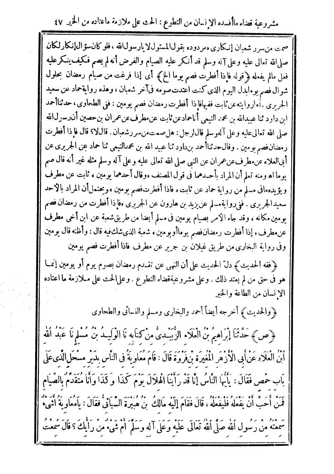 (فقه الحديث) دلّ الحديث على أن النهى عنه تقدم رمضان بصوم يوم أو يومين إنما هو فى حق من لم يعتد ذلك. وعلى مشروعية قضاء التطوع. وعلى الحث على ملازمة ما اعتاده الإنسان من الطاعة والخير