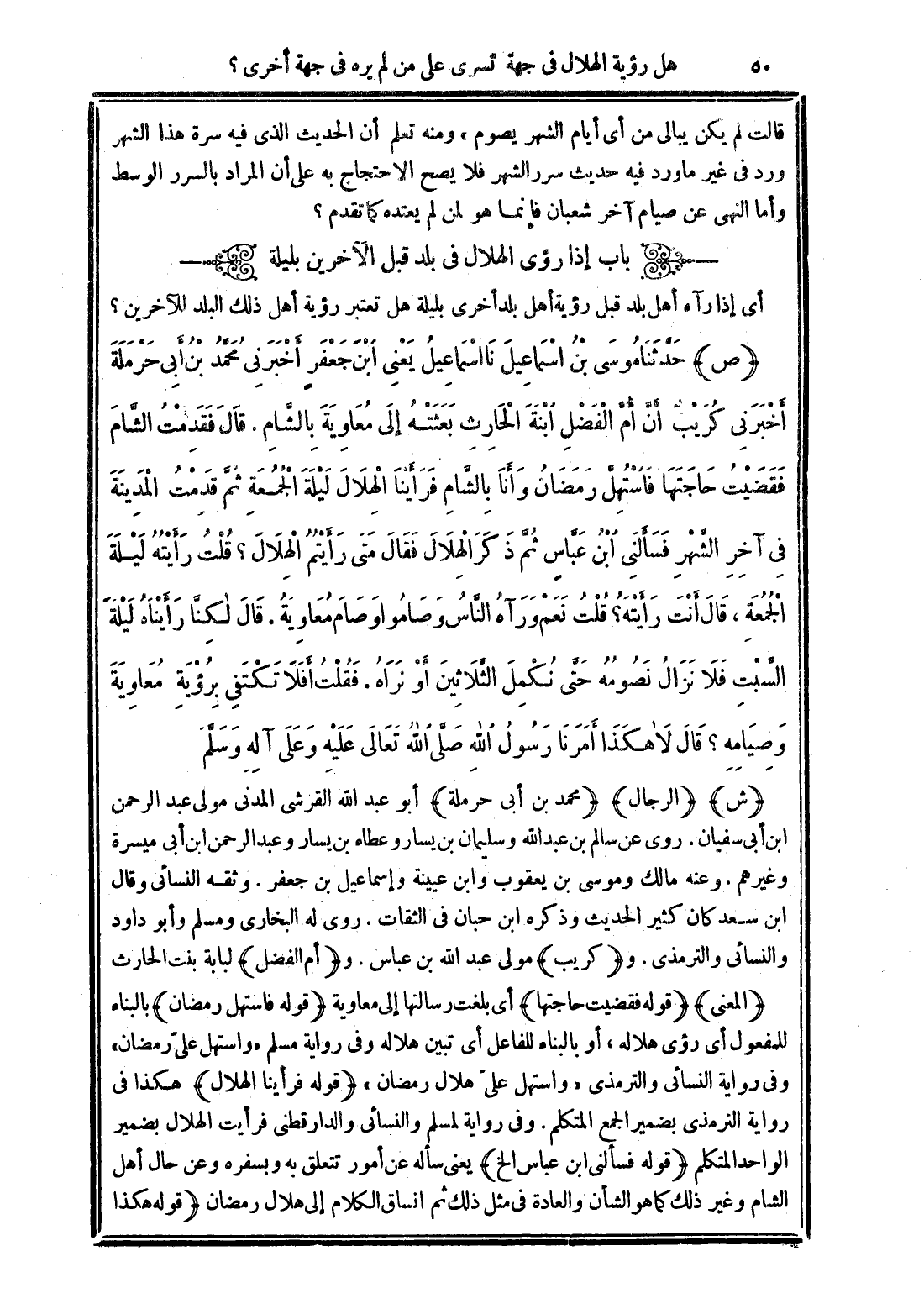 (ص) حَدَّثَنَا مُوسَى بْنُ إِسْمَاعِيلَ نَا إِسْمَاعِيلُ يَعْنِى ابْنَ جَعْفَرٍ أَخْبَرَنِى مُحَمَّدُ بْنُ أَبِى حَرْمَلَةَ أَخْبَرَنِى كُرَيْبٌ أَنَّ أُمَّ الْفَضْلِ ابْنَةَ الْحَارِثِ بَعَثَتْهُ إِلَى مُعَاوِيَةَ بِالشَّامِ. قَالَ فَقَدِمْتُ الشَّامَ فَقَضَيْتُ حَاجَتَهَا فَاسْتُهِلَّ رَمَضَانُ وَأَنَا بِالشَّامِ فَرَأَيْنَا الْهِلاَلَ لَيْلَةَ الْجُمُعَةِ ثُمَّ قَدِمْتُ الْمَدِينَةَ فِى آخِرِ الشَّهْرِ فَسَأَلَنِى ابْنُ عَبَّاسٍ ثُمَّ ذَكَرَ الْهِلاَلَ فَقَالَ مَتَى رَأَيْتُمُ الْهِلاَلَ؟ قُلْتُ رَأَيْتُهُ لَيْلَةَ الْجُمُعَةِ؟ قَالَ أَنْتَ رَأَيْتَهُ؟ قُلْتُ نَعَمْ وَرَآهُ النَّاسُ وَصَامُوا وَصَامَ مُعَاوِيَةُ. قَالَ لَكِنَّا رَأَيْنَاهُ لَيْلَةَ السَّبْتِ فَلاَ نَزَالُ نَصُومُهُ حَتَّى نُكْمِلَ الثَّلاَثِينَ أَوْ نَرَاهُ. فَقُلْتُ أَفَلاَ تَكْتَفِى بِرُؤْيَةِ مُعَاوِيَةَ وَصِيَامِهِ؟ قَالَ لاَ هَكَذَا أَمَرَنَا رَسُولُ اللَّهِ صَلَّى اللَّهُ تَعَالَى عَلَيْهِ وَعَلَى آلِهِ وَسَلَّمَ.