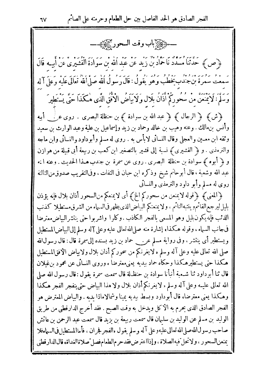 (ص) حَدَّثَنَا مُسَدَّدٌ نَا حَمَّادُ بْنُ زَيْدٍ عَنْ عَبْدِ اللَّهِ بْنِ سَوَادَةَ الْقُشَيْرِىِّ عَنْ أَبِيهِ قَالَ سَمِعْتُ سَمُرَةَ بْنَ جُنْدُبٍ يَخْطُبُ وَهُوَ يَقُولُ: قَالَ رَسُولُ اللَّهِ صَلَّى اللَّهُ تَعَالَى عَلَيْهِ وَعَلَى آلِهِ وَسَلَّمَ: لاَ يَمْنَعَنَّ مِنْ سَحُورِكُمْ أَذَانُ بِلاَلٍ وَلاَ بَيَاضُ الأُفُقِ الَّذِى هَكَذَا حَتَّى يَسْتَطِيرَ.