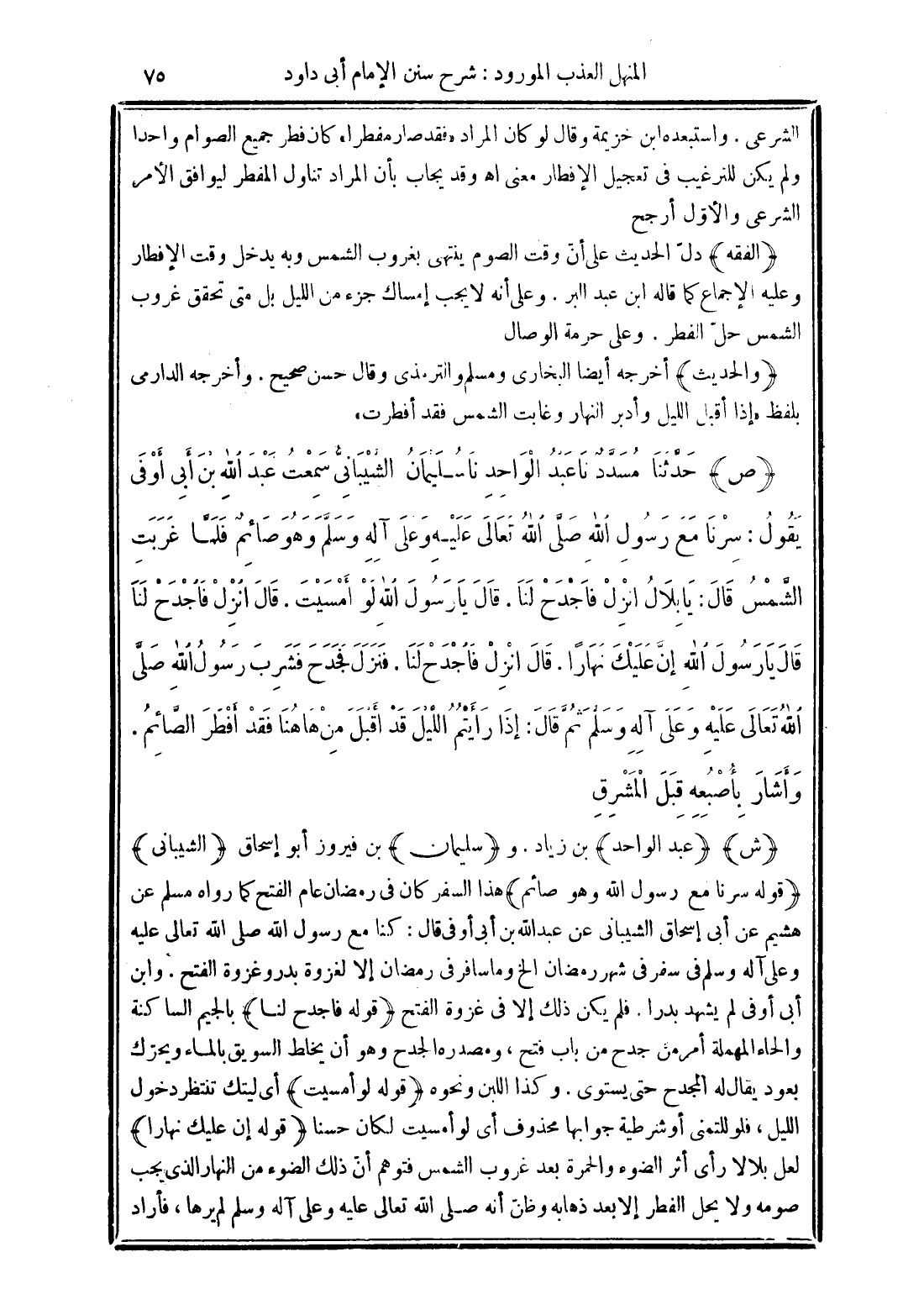 (ص) حَدَّثَنَا مُسَدَّدٌ نَا عَبْدُ الْوَاحِدِ نَا سُلَيْمَانُ الشَّيْبَانِىُّ سَمِعْتُ عَبْدَ اللَّهِ بْنَ أَبِى أَوْفَى يَقُولُ: سِرْنَا مَعَ رَسُولِ اللَّهِ صَلَّى اللَّهُ تَعَالَى عَلَيْهِ وَعَلَى آلِهِ وَسَلَّمَ وَهُوَ صَائِمٌ فَلَمَّا غَرَبَتِ الشَّمْسُ قَالَ: يَا بِلاَلُ انْزِلْ فَاجْدَحْ لَنَا. قَالَ يَا رَسُولَ اللَّهِ لَوْ أَمْسَيْتَ. قَالَ انْزِلْ فَاجْدَحْ لَنَا. قَالَ يَا رَسُولَ اللَّهِ إِنَّ عَلَيْكَ نَهَارًا. قَالَ انْزِلْ فَاجْدَحْ لَنَا. فَنَزَلَ فَجَدَحَ فَشَرِبَ رَسُولُ اللَّهِ صَلَّى اللَّهُ تَعَالَى عَلَيْهِ وَعَلَى آلِهِ وَسَلَّمَ ثُمَّ قَالَ: إِذَا رَأَيْتُمُ اللَّيْلَ قَدْ أَقْبَلَ مِنْ هَا هُنَا فَقَدْ أَفْطَرَ الصَّائِمُ. وَأَشَارَ بِأُصْبُعِهِ قِبَلَ الْمَشْرِقِ.