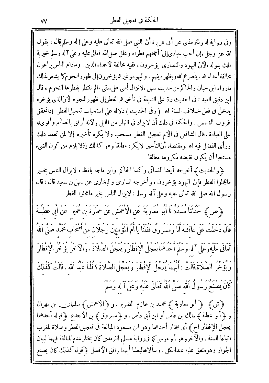 وفي رواية له وللترمذى عن أبي هريرة أنّ النبى صلى الله تعالى عليه وعلى آله وسلم قال: يقول الله عز وجل "إن أحب عبادى إليَّ أعجلهم فطرا" وعلل صلى الله تعالى عليه وعلى آله وسلم خيرية ذلك بقوله "لأنّ اليهود والنصارى يؤخرون" ففيه مخالفة لأعداء الدين. وما دام الناس يراعون مخالفة أعداء الله، ينصرهم الله ويظهر دينهم. واليهود وغيرهم يؤخرون إلى ظهور النجوم كما يشعر بذلك ما رواه ابن حبان والحاكم من حديث سهل "لا تزال أمتى على سنتى ما لم تنتظر بفطرها النجوم" قال ابن دقيق العيد: في الحديث ردّ على الشيعة في تأخيرهم الفطر إلى ظهور النجوم لأنّ الذى يؤخره يدخل في فعل خلاف السنة اهـ (وفي الحديث) دلالة على استحباب تعجيل الفطر إذا تحقق غروب الشمس. والحكمة في ذلك أن لا يزاد في النهار من الليل ولأنه أرفق بالصائم وأقوى له على العبادة. قال الشافعى في الأم تعجيل الفطر مستحب ولا يكره تأخيره إلا لمن تعمد ذلك ورأى الفضل فيه اهـ ومقتضاه أن التأخير لا يكره مطلقا وهو كذلك إذ لا يلزم من كون الشئ مستحبا أن يكون نقيضه مكروها مطلقا.