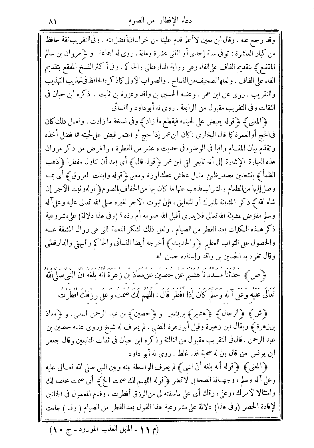 (ش) (الرجال) (هشيم) بن بشير. و (حصين) بن عبد الرحمن السلمى. و (معاذ بن زهرة) ويقال ابن زهيرة وقيل أبو زهرة الضبى. لم يعرف له شيخ وروى عنه حصين بن عبد الرحمن. قال فى التقريب مقبول من الثالثة وذكره ابن حبان فى ثقات التابعين وقال جعفر ابن يونس من قال إنّ له صحبة فقد غلط. روى له أبو داود