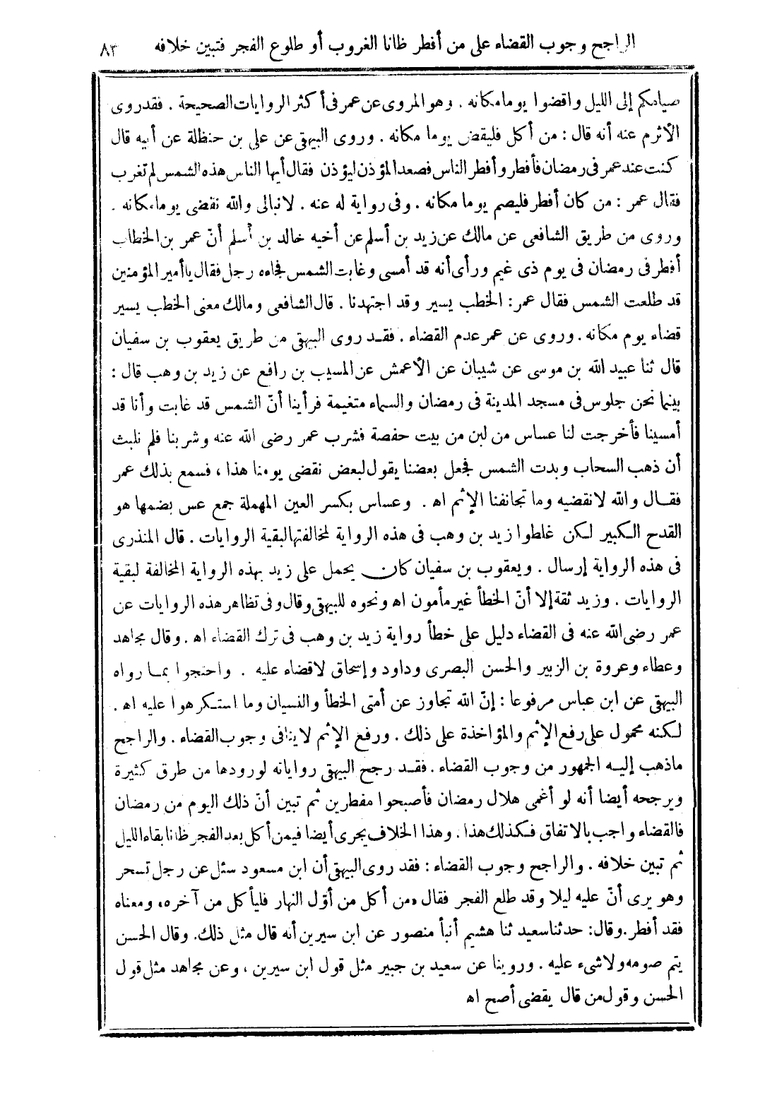 صيامكم إلى الليل واقضوا يوما مكانه. وهو المروى عن عمر فى أكثر الروايات الصحيحة. فقد روى الأثرم عنه أنه قال: من أكل فليقض يوما مكانه. وروى البيهقى عن على بن حنظلة عن أبيه قال كنت عند عمر فى رمضان فأفطر وأفطر الناس فصعد المؤذن ليؤذن فقال أيها الناس هذه الشمس لم تغرب فقال عمر: من كان أفطر فليصم يوما مكانه. وفى رواية له عنه. لا نبالى والله نقضى يوما مكانه. وروى من طريق الشافعى عن مالك عن زيد بن أسلم عن أخيه خالد بن أسلم أنّ عمر بن الخطاب أفطر فى رمضان فى يوم ذى غيم ورأى أنه قد أمسى وغابت الشمس فجاءه رجل فقال يا أمير المؤمنين قد طلعت الشمس فقال عمر: الخطب يسير وقد اجتهدنا. قال الشافعى ومالك معنى الخطب يسير قضاء يوم مكانه. وروى عن عمر عدم القضاء. فقد روى البيهقى من طريق يعقوب بن سفيان قال ثنا عبيد الله بن موسى عن شيبان عن الأعمش عن المسيب بن رافع عن زيد بن وهب قال: بينما نحن جلوس فى مسجد المدينة فى رمضان والسماء متغيمة فرأينا أنّ الشمس قد غابت وأنا قد أمسينا فأخرجت لنا عساس من لبن من بيت حفصة فشرب عمر رضى الله عنه وشربنا فلم نلبث أن ذهب السحاب وبدت الشمس فجعل بعضنا يقول لبعض نقضى يومنا هذا، فسمع بذلك عمر فقال والله لا نقضيه وما تجانفنا الإثم اهـ. وعساس بكسر العين المهملة جمع عس بضمها هو القدح الكبير لكن غلطوا زيد بن وهب فى هذه الرواية لمخالفتها لبقية الروايات. قال المنذرى فى هذه الرواية إرسال. ويعقوب بن سفيان كان يحمل على زيد بهذه الرواية المخالفة لبقية الروايات. وزيد ثقة إلا أنّ الخطأ غير مأمون اهـ ونحوه للبيهقى وقال وفى تظاهر هذه الروايات عن عمر رضي الله عنه فى القضاء دليل على خطأ رواية زيد بن وهب فى ترك القضاء اهـ. وقال مجاهد وعطاء وعروة بن الزبير والحسن البصرى وداود وإسحاق لا قضاء عليه. واحتجوا بما رواه البيهقى عن ابن عباس مرفوعا: إنّ الله تجاوز عن أمتى الخطأ والنسيان وما استكرهوا عليه اهـ. لكنه محمول على رفع الإثم والمؤاخذة على ذلك. ورفع الإثم لا ينافى وجوب القضاء. والراجح ما ذهب إليه الجمهور من وجوب القضاء. فقد رجح البيهقى رواياته لورودها من طرق كثيرة ويرجحه أيضا أنه لو أغمى هلال رمضان فأصبحوا مفطرين ثم تبين أنّ ذلك اليوم من رمضان فالقضاء واجب بالاتفاق فكذلك هذا. وهذا الخلاف يجرى أيضا فيمن أكل بعد الفجر ظانا بقاء الليل ثم تبين خلافه. والراجح وجوب القضاء: فقد روى البيهقى أن ابن مسعود سئل عن رجل تسحر وهو يرى أنّ عليه ليلا وقد طلع الفجر فقال "من أكل من أوّل النهار فليأكل من آخره" ومعناه فقد أفطر. وقال: حدثنا سعيد ثنا هشيم أنبأ منصور عن ابن سيرين أنه قال مثل ذلك. وقال الحسن يتم صومه ولا شئ عليه. وروينا عن سعيد بن جبير مثل قول ابن سيرين، وعن مجاهد مثل قول الحسن وقول من قال يقضى أصح اهـ