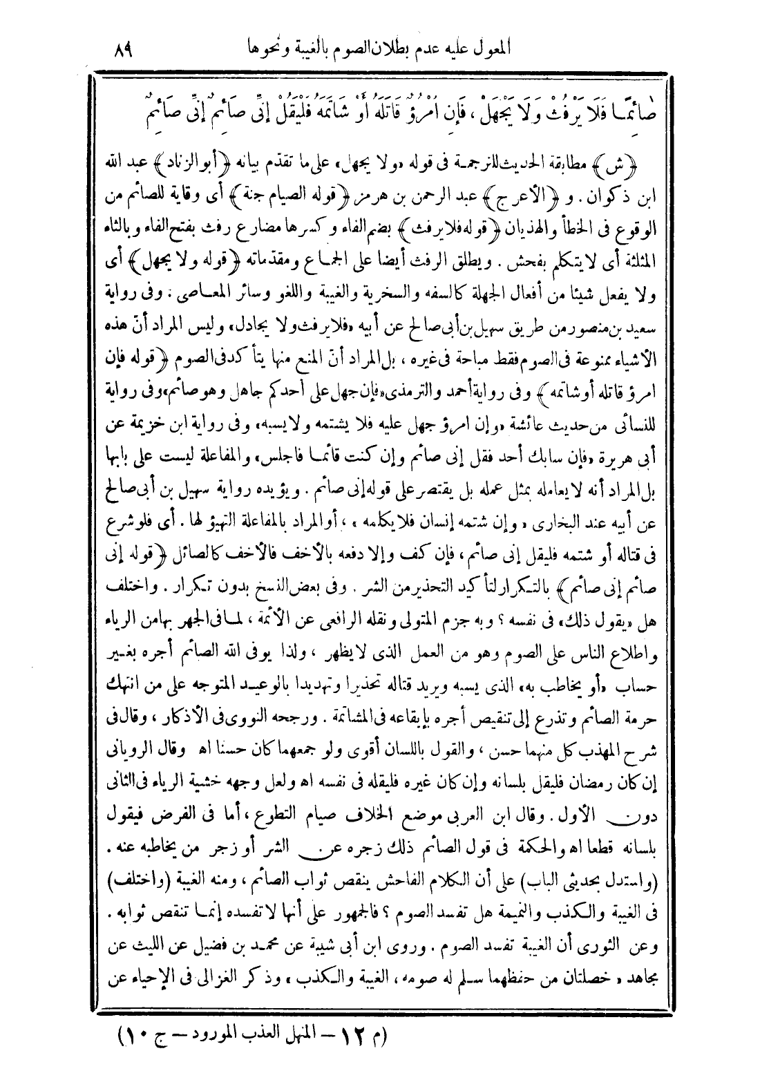 (قوله إنى صائم إنى صائم) بالتكرار لتأكيد التحذير من الشر. وفى بعض النسخ بدون تكرار. واختلف هل "يقول ذلك" فى نفسه؟ وبه جزم المتولى ونقله الرافعى عن الأئمة، لما فى الجهر بها من الرياء واطلاع الناس على الصوم وهو من العمل الذى لا يظهر، ولذا يوفى الله الصائم أجره بغير حساب "أو يخاطب به" الذى يسبه ويريد قتاله تحذيرا وتهديدا بالوعيد المتوجه على من انتهك حرمة الصائم وتذرع إلى تنقيص أجره بإيقاعه فى المشاتمة. ورجحه النووى فى الأذكار، وقال فى شرح المهذب كل منهما حسن، والقول باللسان أقوى ولو جمعهما كان حسنا اهـ وقال الرويانى إن كان رمضان فليقل بلسانه وإن كان غيره فليقله فى نفسه اهـ ولعل وجهه خشية الرياء فى الثانى دون الأول. وقال ابن العربى موضع الخلاف صيام التطوع، أما فى الفرض فيقول بلسانه قطعا اهـ والحكمة فى قول الصائم ذلك زجره عن الشر أو زجر من يخاطبه عنه. (واستدل بحديثى الباب) على أن الكلام الفاحش ينقص ثواب الصائم، ومنه الغيبة (واختلف) فى الغيبة والكذب والنميمة هل تفسد الصوم؟ فالجمهور على أنها لا تفسده إنما تنقص ثوابه. وعن الثورى أن الغيبة تفسد الصوم. وروى ابن أبى شيبة عن محمد بن فضيل عن الليث عن مجاهد "خصلتان من حفظهما سلم له صومه، الغيبة والكذب" وذكر الغزالى فى الإحياء عن