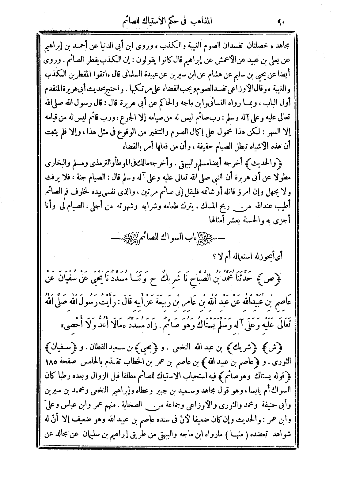 (ص) حَدَّثَنَا مُحَمَّدُ بْنُ الصَّبَّاحِ نَا شَرِيكٌ ح وَثَنَا مُسَدَّدٌ نَا يَحْيَى عَنْ سُفْيَانَ عَنْ عَاصِمِ بْنِ عُبَيْدِ اللَّهِ عَنْ عَبْدِ اللَّهِ بْنِ عَامِرِ بْنِ رَبِيعَةَ عَنْ أَبِيهِ قَالَ: رَأَيْتُ رَسُولَ اللَّهِ صَلَّى اللَّهُ تَعَالَى عَلَيْهِ وَعَلَى آلِهِ وَسَلَّمَ يَسْتَاكُ وَهُوَ صَائِمٌ. زَادَ مُسَدَّدٌ "مَا لاَ أَعُدُّ وَلاَ أُحْصِى".