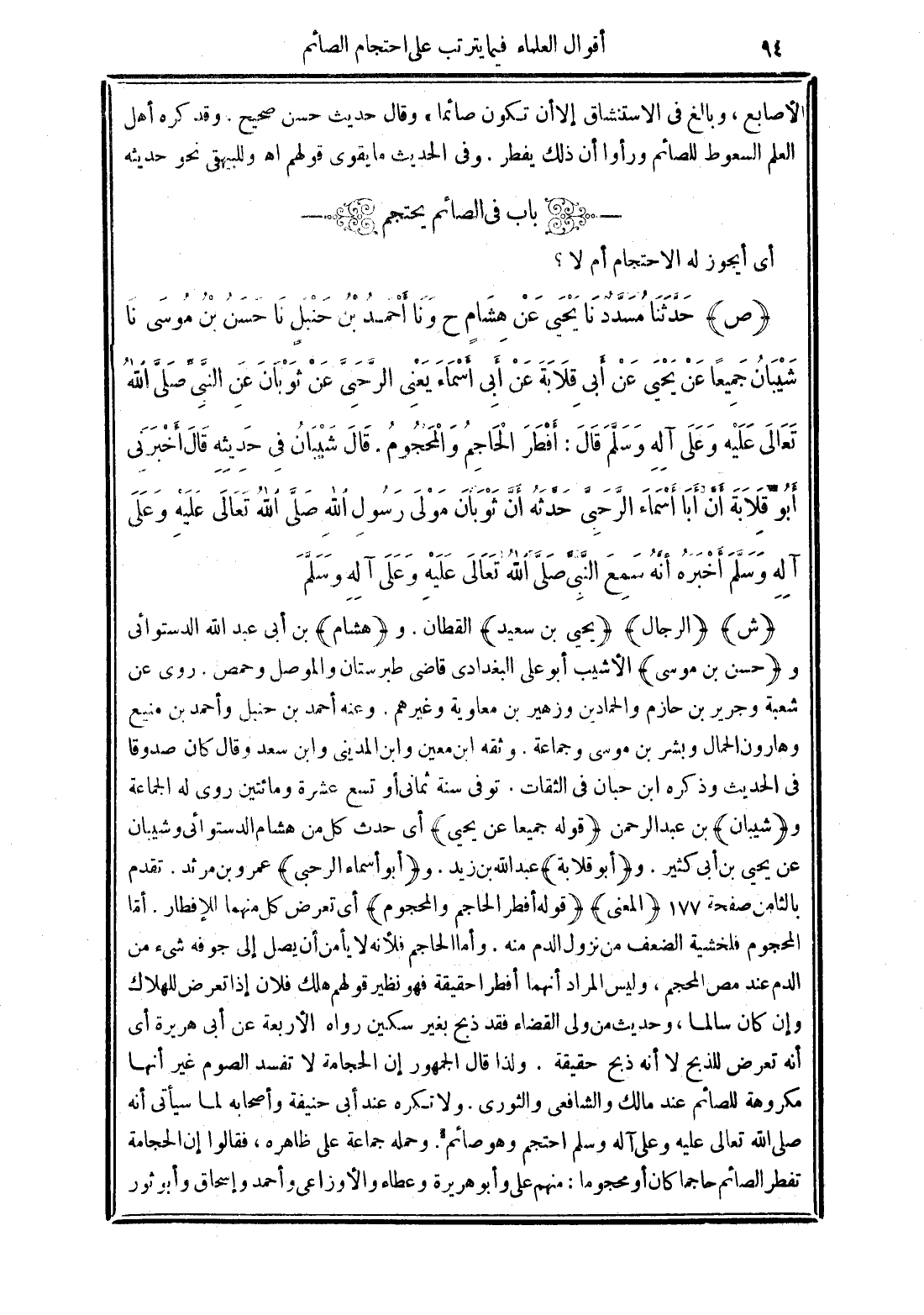 (ص) حَدَّثَنَا مُسَدَّدٌ نَا يَحْيَى عَنْ هِشَامٍ ح وَنَا أَحْمَدُ بْنُ حَنْبَلٍ نَا حَسَنُ بْنُ مُوسَى نَا شَيْبَانُ جَمِيعًا عَنْ يَحْيَى عَنْ أَبِى قِلاَبَةَ عَنْ أَبِى أَسْمَاءَ يَعْنِى الرَّحَبِىَّ عَنْ ثَوْبَانَ عَنِ النَّبِىِّ صَلَّى اللَّهُ تَعَالَى عَلَيْهِ وَعَلَى آلِهِ وَسَلَّمَ قَالَ: أَفْطَرَ الْحَاجِمُ وَالْمَحْجُومُ. قَالَ شَيْبَانُ فِي حَدِيثِه قَالَ أَخْبَرَنِى أَبُو قِلاَبَةَ أَنَّ أَبَا أَسْمَاءَ الرَّحَبِىَّ حَدَّثَهُ أَنَّ ثَوْبَانَ مَوْلَى رَسُولِ اللَّهِ صَلَّى اللَّهُ تَعَالَى عَلَيْهِ وَعَلَى آلِهِ وَسَلَّمَ أَخْبَرَهُ أَنَّهُ سَمِعَ النَّبِيَّ صَلَّى اللَّهُ تَعَالَى عَلَيْهِ وَعَلَى آلِهِ وَسَلَّمَ.