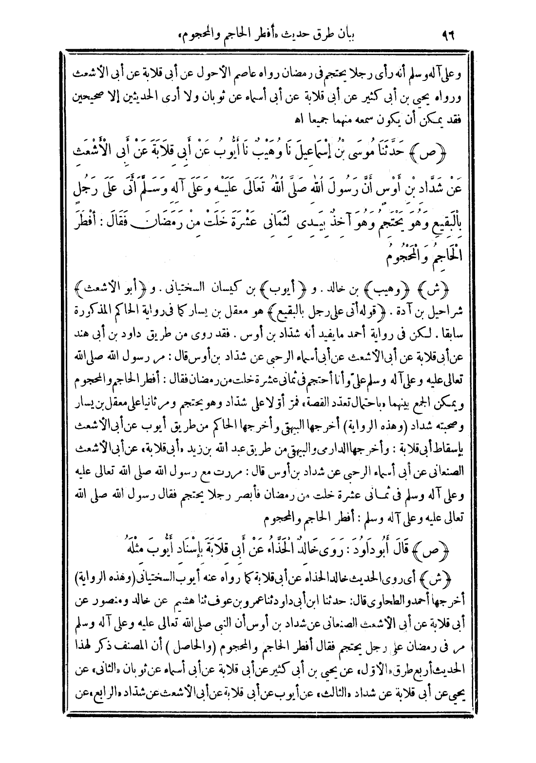وعلى آله وسلم أنه رأى رجلا يجتجم فى رمضان رواه عاصم الأحول عن أبى قلابة عن أبى الأشعث ورواه يحيى بن أبى كثير عن أبى قلابة عن أبى أسماء عن ثوبان ولا أرى الحديثين إلا صحيحين فقد يمكن أن يكون سمعه منهما جميعا اهـ