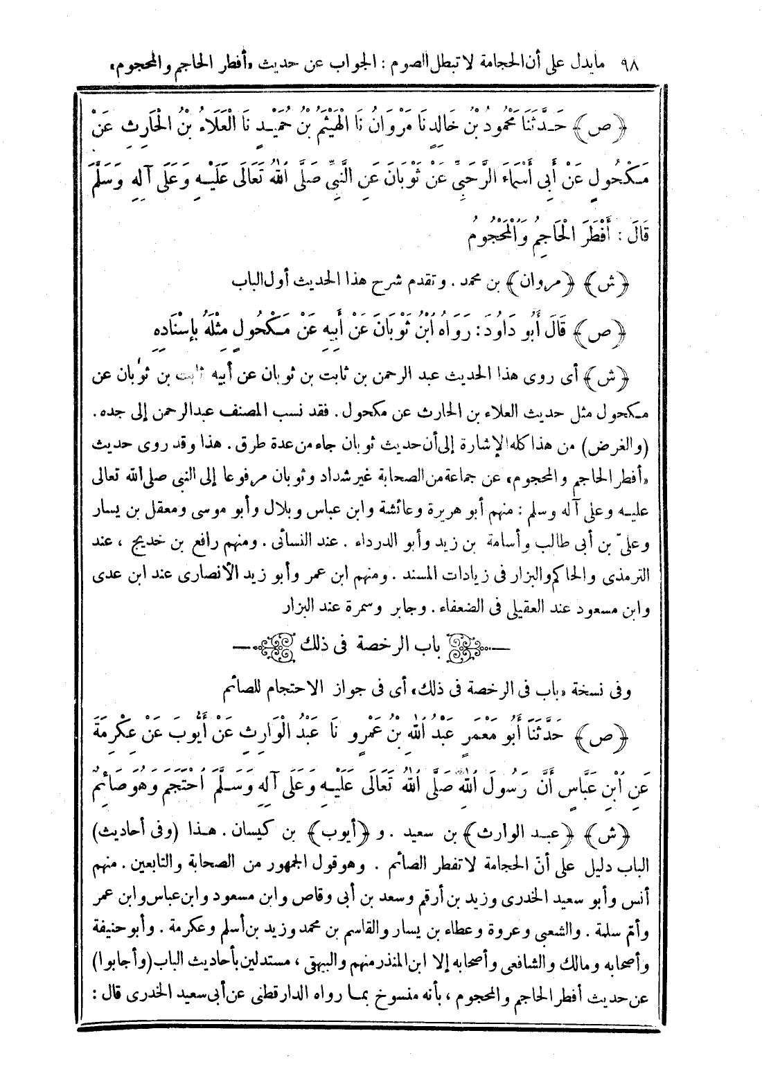 (ش) (عبد الوارث) بن سعيد. و (أيوب) بن كيسان. هذا (وفى أحاديث) الباب دليل على أن الحجامة لا تفطر الصائم. وهو قول الجمهور من الصحابة والتابعين. منهم أنس وأبو سعيد الخدرى وزيد بن أرقم وسعد بن أبى وقاص وابن مسعود وابن عباس وابن عمر وأمّ سلمة. والشعبى وعروة وعطاء بن يسار والقاسم بن محمد وزيد بن أسلم وعكرمة. وأبو حنيفة وأصحابه ومالك والشافعى وأصحابه إلا ابن المنذر منهم والبيهقى، مستدلين بأحاديث الباب (وأجابوا) عن حديث أفطر الحاجم والمحجوم، بأنه منسوخ بما رواه الدارقطنى عن أبى سعيد الخدرى قال: