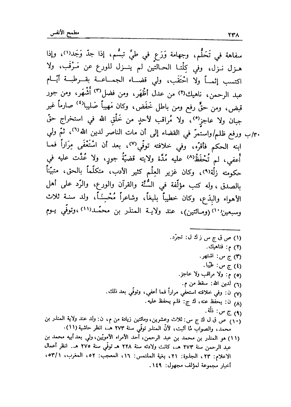 سفاهة في تَحلُّم، وَرع في طيِّ تبسُّم، إذ جدّ وَجد، وإذا هزل نزل، وفي كلتا الحالتين لم ينزل للورع عن مَرقب، ولا اكتسب إثماً ولا احتقب، ولي قضاء الجماعة بقرطبة أيام عبد الرحمن، ناهيك من عدل أظهر، ومن فضل أشهر، ومن جور قبض، ومن حقٍّ رفع ومن باطل خَفض، وكان مهيباً صليباً صارماً غير جبان ولا عاجزٍ، ولا مُراقب لأحدٍ من خلق الله في استخراج حقّ ورفع ظلم واستمر في القضاء إلى أن مات الناصر لدين الله، ثم ولي ابنه الحكم فأقرّه، وفي خلافته توفّي، بعد أن استعفى مِراراً فما أُعفي، لم تُحفظ عليه مُدَّة ولا يته قضيةُ جورٍ، ولا عُدَّت عليه في حكومته زلّة، وكان غزير العِلم كثير الأدب، متكلماً بالحق، متبيّناً بالصدق، وله كتب مؤلفة في السُّنَّة والقرآن والورع، والرّد على أهل الأهواء والبِدَع، وكان خطيباً بليغاً، وشاعراً مُحسِنَاً، ولد سنة ثلاث وسبعين (ومائتين) عند ولاية المنذر بن محمد، وتوفي يوم