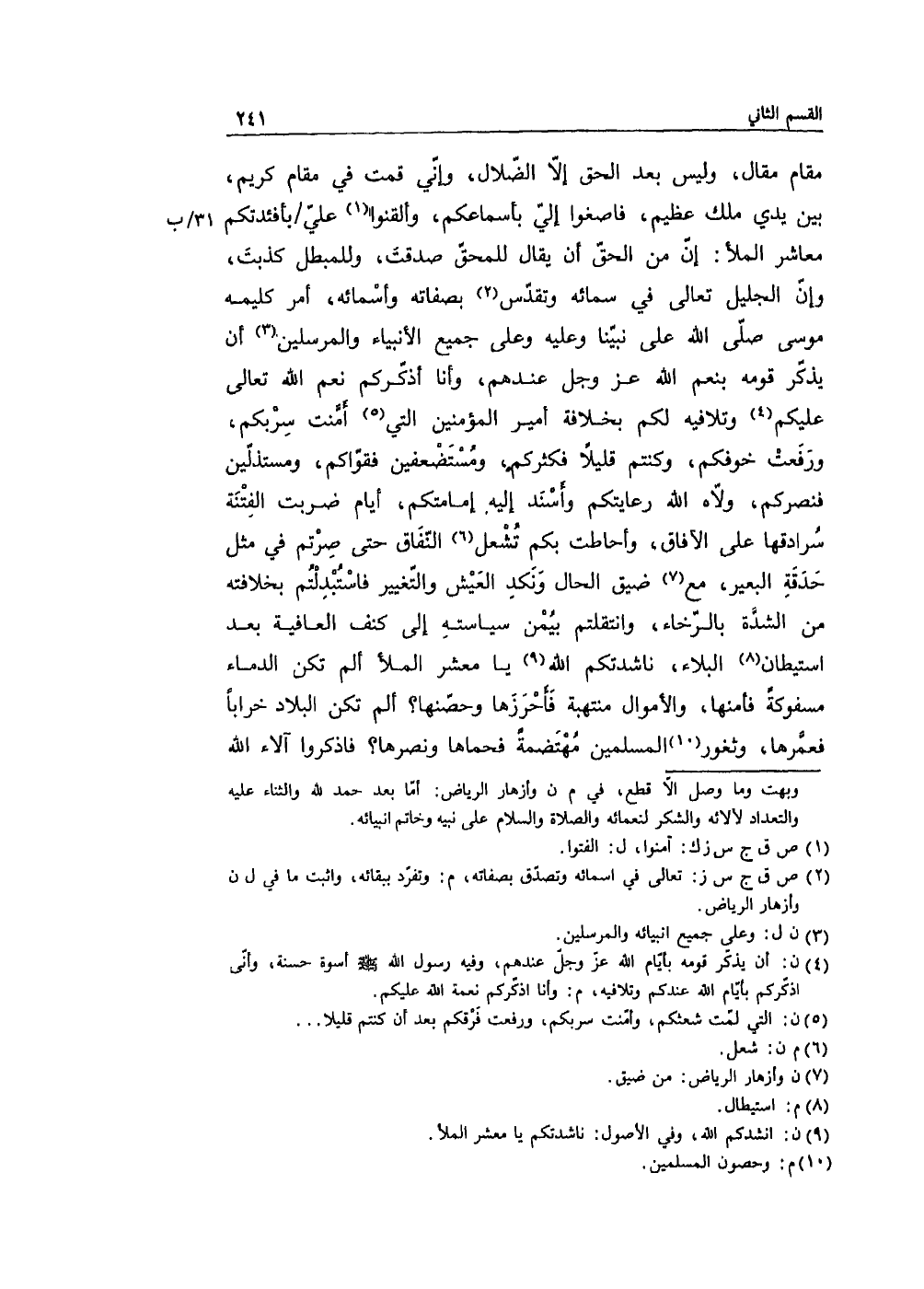 مقام مقال، وليس بعد الحق إلاّ الضّلال، وإنّي قمت في مقام كريم، بين يدي ملك عظيم، فأصغوا إليّ بأسماعكم، وألقنوا عليّ بأفئدتكم معاشر الملأ: إن من الحقّ أن يُقال للمُحقّ صدقتَ، وللمُبطل كذبتَ، وإن الجليل تعالى في سمائه وتقدّس بصفاته وأسمائه، أمر كليمه موسى صلى الله على نبيّنا وعليه وعلى جميع الأنبياء والمرسلين أن يذكّر قومه بنعم الله عز وجل عندهم، وأنا أذكّركم نعم الله تعالى عليكم وتلافيه لكم بخلافة أمير المؤمنين التي أمَّنت سِربكم، ورَفعت خوفكم، وكنتم قليلاً فكثركم، ومُستَضعفين فقوّاكم، ومستذلّين فنصركم، ولاّه الله رعايتكم وأسنَد إليه إمامتكم، أيام ضربت الفِتنَة سُرادقها على الآفاق، وأحاطت بكم تُشعل النّفاق حتى صِرتم في مثل حَدقَةٍ البعير، مع ضيق الحال ونَكدِ العيش والتّغيير فاستُبدِلتُم بخلافته من الشدَّة بالرّخاء، وانتقلتم بيُمن سياسته إلى كنف العافية بعد استيطان البلاء، ناشدتكم الله يا معشر الملأ ألم تكن الدماء مسفوكةً فأمنها، والأموال منتهبة فأحرزَها