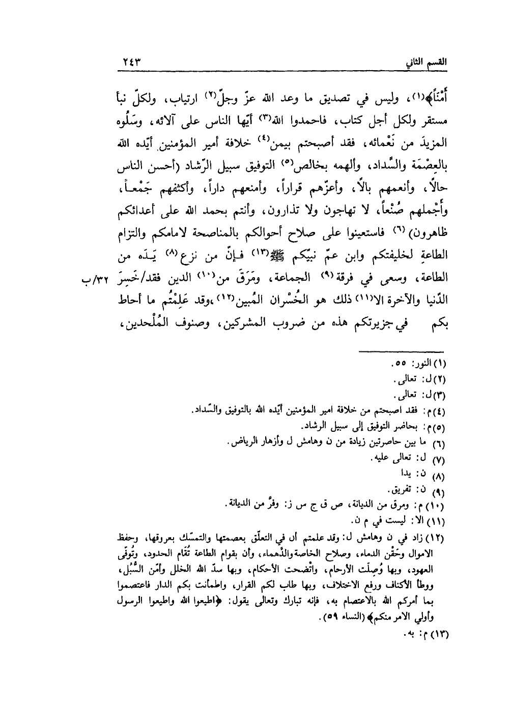أَمْنَاً)، وليس في تصديق ما وعد الله عزّ وجلّ ارتياب، ولكل نبأ مستقر ولكل أجل كتاب، فاحمدوا الله أيها الناس على آلائه، وسَلُوه المزيد من نَعمائه، فقد أصبحتم بيمن خلافة أمير المؤمنين أيده الله بالعِصمَة والسَّداد، وألهمه بخالص التوفيق سبيل الرّشاد أحسن الناس حالاً، وأعمهم بالاً، وأعزّهم قراراً، وأمنعهم داراً، وأكثفهم جَمعاً، وأجملهم صُنعاً، لا تهاجون ولا تذارون، وأنتم بحمد الله على أعدائكم ظاهرون فاستعينوا على صلاح أحوالكم بالمناصحة لإمامكم والتزام الطاعة لخليفتكم وابن عمّ نبيكم (صلى الله عليه وسلم) فإن من نزع يَده من الطاعة، وسعى في فرقة الجماعة، ومَرق من الدين فقد خَسِر الدُّنيا والآخرة إلاّ ذلك هو الخُسران المُبين، وقد عَلِمتم ما أحاط بكم في جزيرتكم هذه من ضروب المشركين، وصنوف المُلحدين،