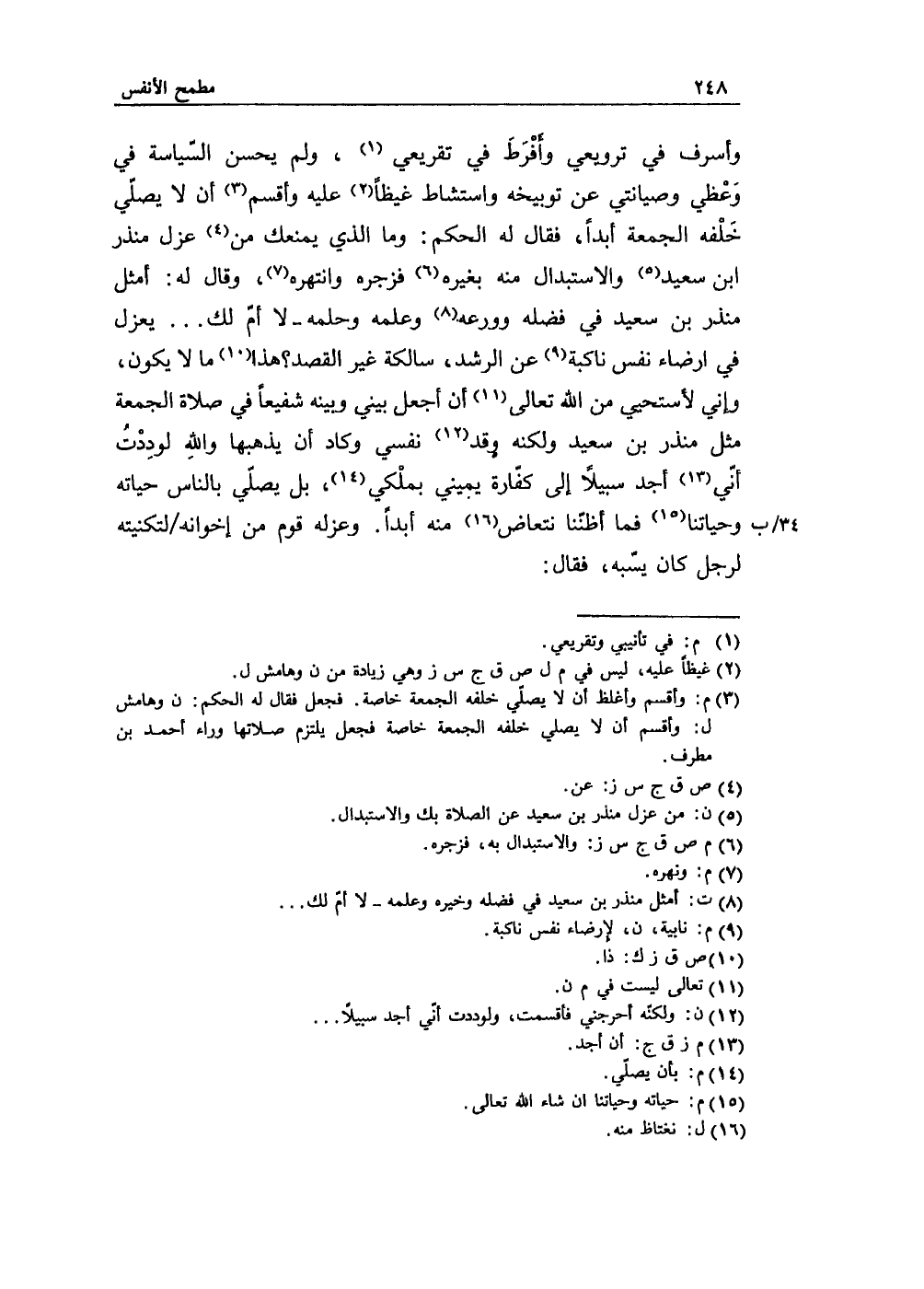 إرضاء نفس ناكبة عن الرُشد، سالكة غير القصد؟ هذا ما لا يكون، وإني لأستحيي من الله تعالى أن أجعل بيني وبينه شفيعاً في صلاة الجمعة مذل منذر بن سعيد ولكنه وقد نفسي وكاد أن يُذهبها واللهِ لودِدتُ أنّي أجد سبيلاً إلى كفّارة يميني بملْكي، بل يصلّي بالناس حياته وحياتنا فما أظنّنا نتعاض منه أبداً. وعزله قوم من إخوانه لتكنيته لرجل كان يسّبه، فقال: