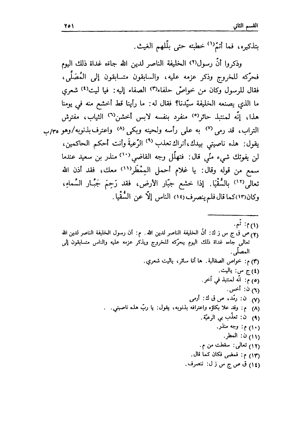 وذكروا أن رسول الخليفة الناصر لدين الله جاءه غداة ذلك اليوم فحرّكه للخروج عزمه عليه، والسابقون متسابقون إلى المُصلَّى، فقال للرسول وكان من خواصّ حلفاء الصفاء إليه: فياليت شعري ما الذي يصنعه الخليفة سيّدنا؟ فقال له: ما رأينا قط أخشع منه في يومنا هذا، إنه لمنتبذ حائر منفرد بنفسه لابس أخشن الثياب، مفترش التراب، قد رمى به على رأسه ولحيته وبكى واعترف بذنوبه وهو يقول: هذه ناصيتي بيدك، أتراك تعذب الرّعية وأنت أحكم الحاكمين، لن يفوتك شيء منيّ، قال: فتهلّل وجه القاضي منذر بن سعيد عندما سمع من قوله، وقال: يا غلام أحمل المِمطَر معك، فقد أذن الله تعالى بالسُّقيَا، إذا خشع جبّار الأرض، فقد رَحِمَ جَبَّار السَّماء، وكان كما قال فلم ينصرف الناس إلاّ عن السُّقْيا.