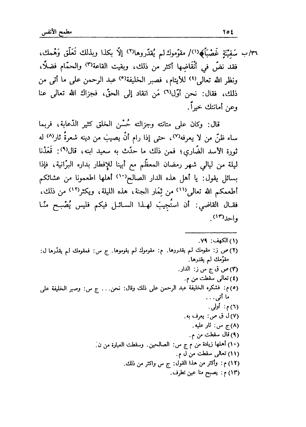 سَفِينَةٍ غَصْبَاً) مقوّموك لم يُقدّروها إلا بكذا وبذلك تَعلّق وَهمك، فقد نضّ في أنقاضِها أكثر من ذلك، وبقيت القاعة والحمام فضلاً، ونظر الله تعالى للأيتام، فصبر الخليفة عبد الرحمن على ما أتى من ذلك، فقال: نحن أول من انقاد إلى الحقّ، فجزاك الله تعالى عنا وعن أمانتك خيراً.