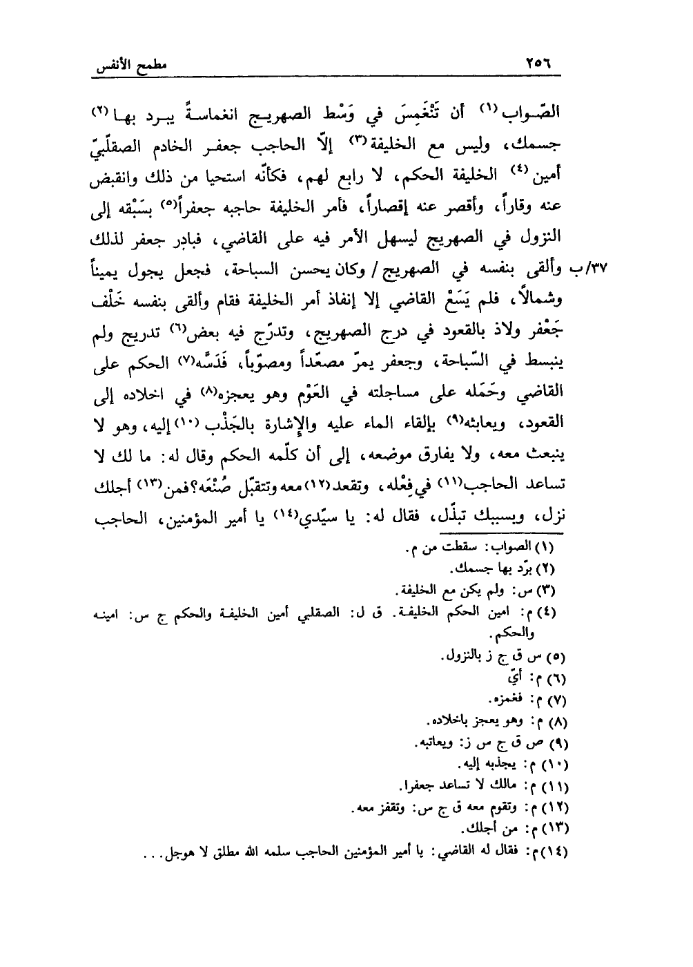 الصّواب أن تَنغمِس في وَسط الصهريج انغماسةً يبرد بها جسمك، وليس مع الخليفة إلاّ الحاجب جعفر الخادم الصقلّبيّ أمين الخليفة الحكم، لا رابع لهم، فكأنه استحيا من ذلك وانقبض عنه وقاراً، وأقصر عنه إقصاراً، فأمر الخليفة حاجبه جعفراً بسَبقه إلى النزول في الصهريج ليسهل الأمر فيه على القاضي، فبادر جعفر لذلك وألقى بنفسه في الصهريج وكان يحسن السباحة، فجعل يجول يميناً وشمالاً، فلم يَسَع القاضي إلاّ إنفاذ أمر الخليفة فقام وألقى بنفسه خّلف جَعفر ولاذ بالقعود في درج الصهريج، وتدرّج فيه بعض تدريج ولم ينبسط في السّباحة،