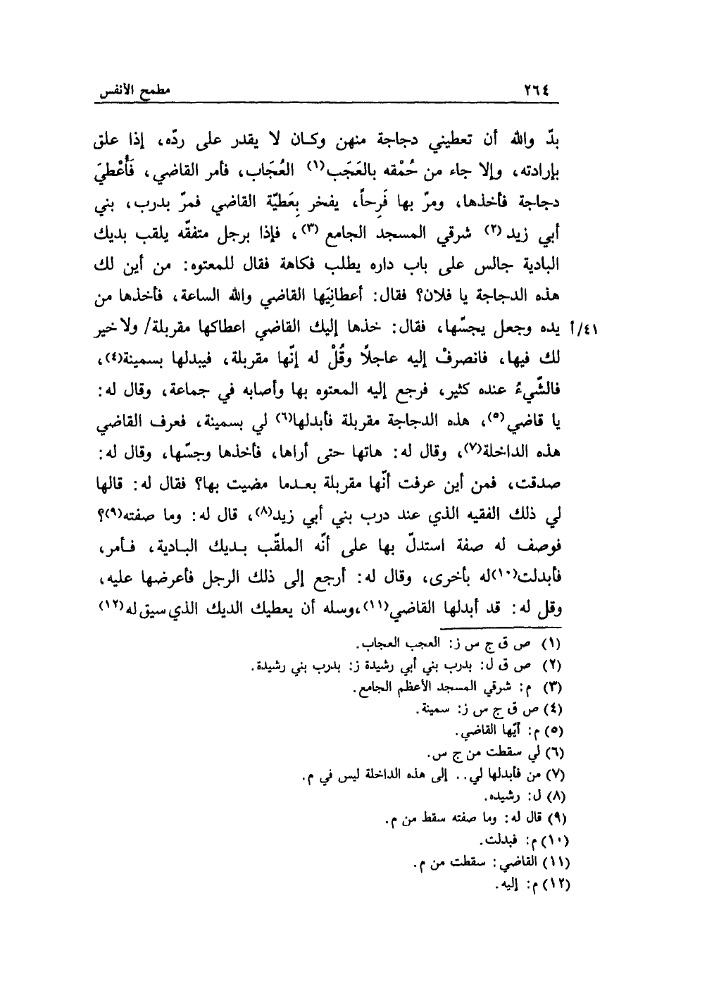 بدّ والله أن تعطيني دجاجة منهن وكان لا يقدر على ردّه، إذا علق بإرادته، وإلا جاء من حُمقه بالعَجَب العُجَاب، فأمر القاضي، فأُعطيَ دجاجة فأخذها، ومرّ بها فَرِحاً، يفخر بِعَطيّة القاضي فمرّ بدرب، بني أبي زيد شرقي