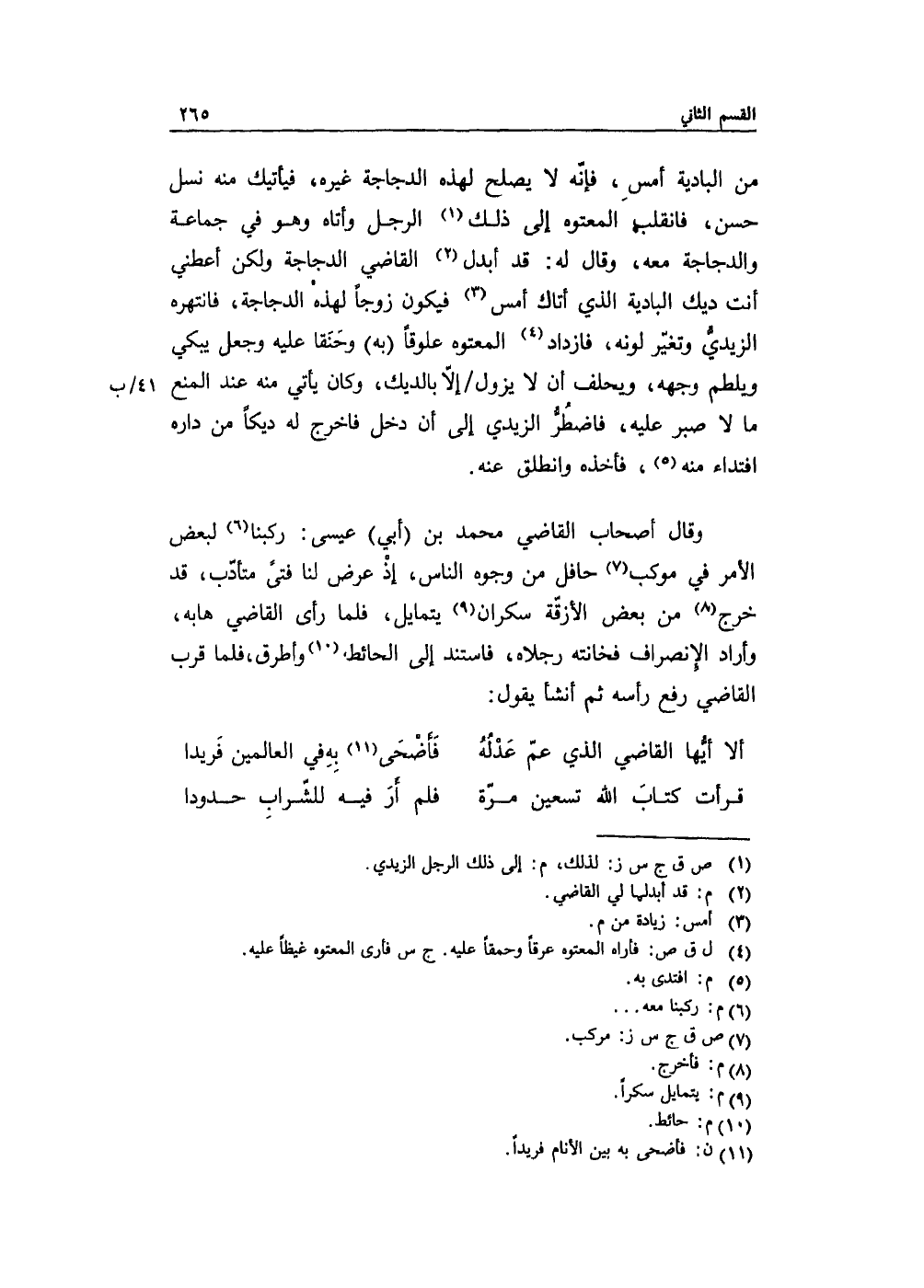 من البادية أمس، فإنه لا يصلح لهذه الدجاجة غيره، فيأتيك منه نسل حسن، فانقلب المعتوه إلى ذلك الرجل وأتاه وهو في جماعة والدجاجة معه، وقال له: قد أبدل القاضي الدجاجة ولكن أعطني أنت ديك البادية الذي أتاك أمس فيكون زوجاً لهذه الدجاجة، فانتهره الزيديُّ وتغيّر لونه، فازداد المعتوه علوقاً (به) وحَنقَا عليه وجعل يبكي ويلطم وجهه، ويحلف أن لا يزول إلاّ بالديك، وكان يأتي منه عند المنع ما لا صبر عليه، فاضطُرُّ الزيدي إلى أن دخل فاخرج له ديكاً من داره افتداء منه، فأخذه وانطلق عنه.