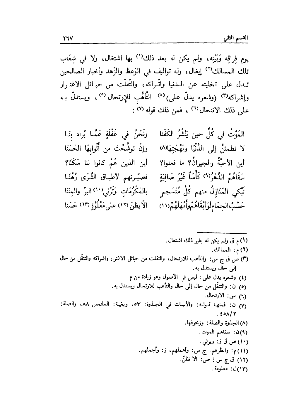 يوم فِراقِه وبَينِه، ولم يكن له بعد ذلك بها اشتغال، ولا في شِعَاب تلك المسالك إيغال، وله تواليف في الوَعظ والزّهد وأخبار الصالحين تدل على تخليته عن الدنيا واتّراكه، والتّفلّت من حبائل الاغترار وإشراكه وشعره يدلّ على التَّأهُّب للارتحال، ويستدلّ به على ذلك الانتحال، فمن ذلك قوله: