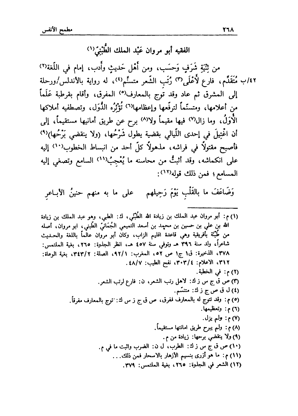 من ثِنيةِ شرفٍ وحَسب، ومن أهل حَديث وأدب، إمام في اللّغة مُتقدِّم، فارع لأعلى رُتب الشعر متسنِّم، له رواية بالأندلس ورحلة إلى المشرق ثم عاد وقد توج بالمعارف المفرق، وأقام بقُرطبة عَلَماً من أعلامها، ومتسنّماً لترفّعها وإعظامها تُؤثِرُه الدُّول، وتصطفيه أملاكها الأُول، وما زال فيها مقيماً ولا برح عن طريق أمانيها مستقيماً، إلى أن اغتيل في إحدى الليالي بقضية يطول شرحُها، ولا ينقضي بَرحُها فأصبح مقتولاً في فراشه، مذهولاً كل أحد من انبساط الخطوب إليه على انكماشه، وقد أثبتُّ من محاسنه ما يُعجِبُ السامع وتصغي إليه المسامع، فمن ذلك قوله: