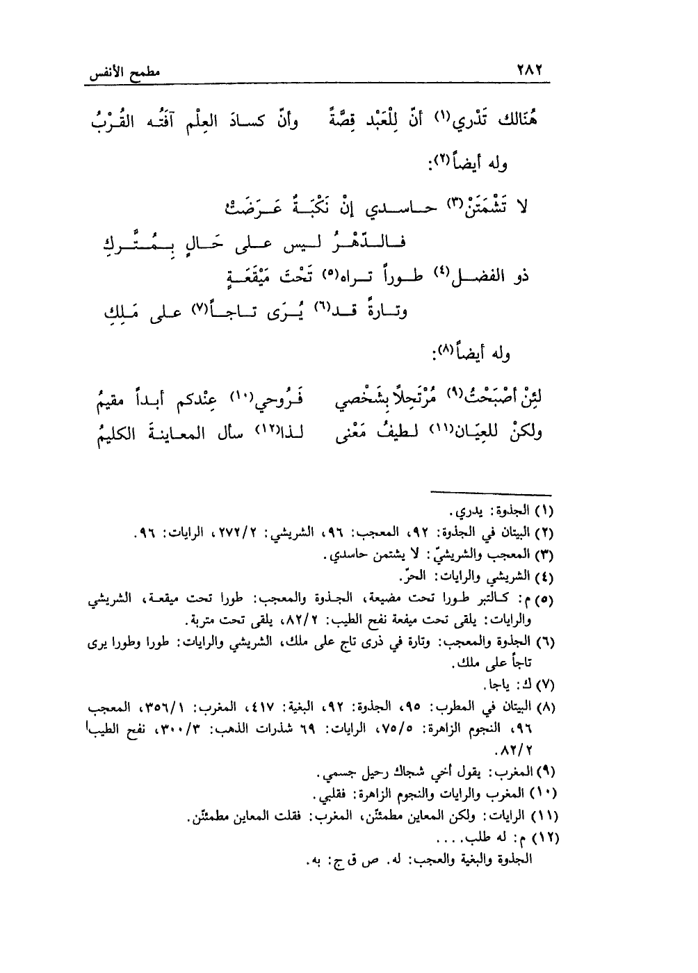 هُنَالك تَدْري أنّ لِلْعَبد قِصَّةً ... وأنّ كسادَ العِلْم آفَتُه القُرْبُ