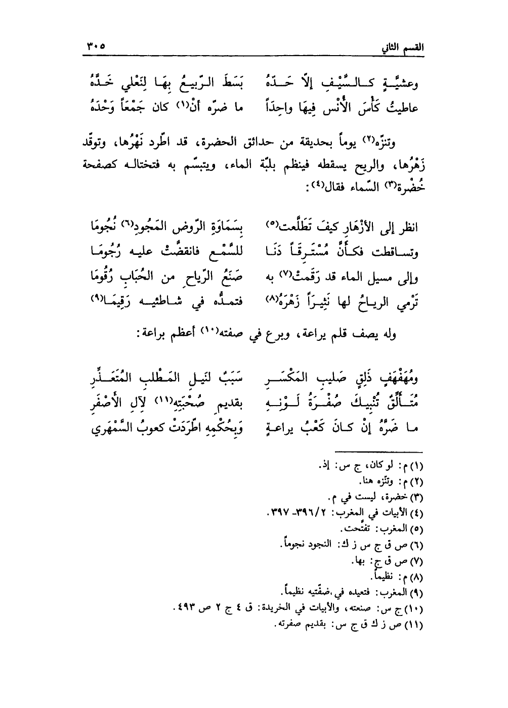 وتنزّه يوماً بحديقة من حدائق الحضرة، قد اطّرد نَهرُها، وتوقّد زَهرُها، والريح يسقطه فيظم بلبّة الماء، ويتبسّم به فتختاله كصفحة خُضْرة السّماء فقال: