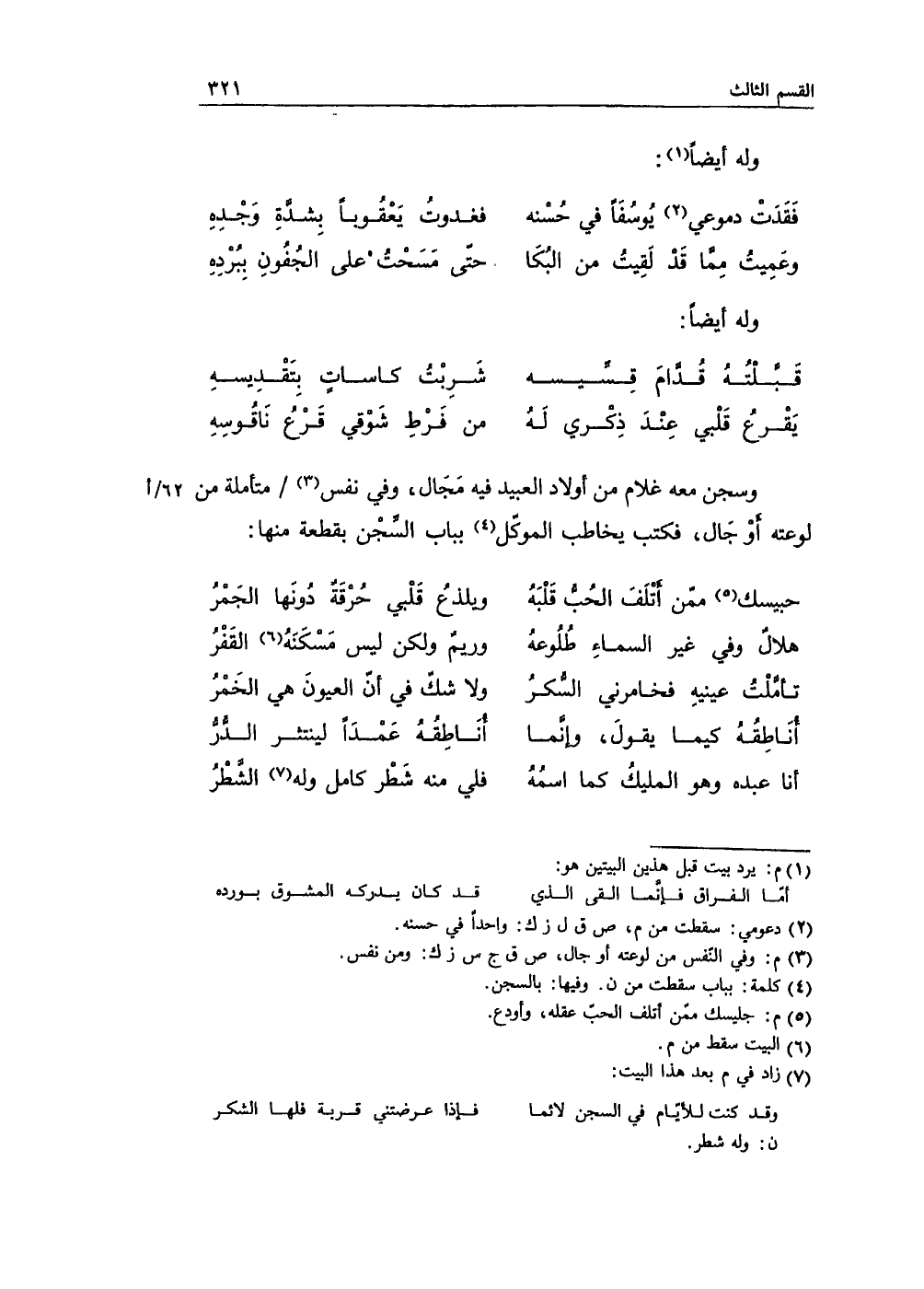 وسُجن معه غلام من أولاد العبيد فيه مَجال، وفي نفس متأملة من لوعته أو جَال، فكتب يخاطب الموكّل بباب السِّجن بقطعة منها: