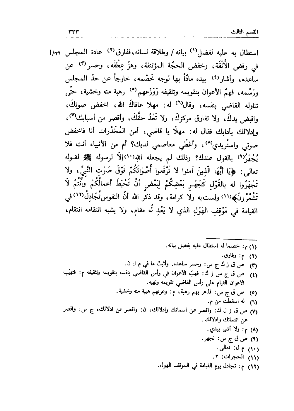 وتثقيفه ووَزعهم رهبة منه وخشية، حتى تناوله القاضي بنفسه، وقال له: مهلاً عافاك الله، اخفض صوتك، واقبض يدك، ولا تفارق مركزك، ولا تَعدُ حقَّك، وأقصر من أسبابك، وإدلالك بآدابك، فقال له: مهلاً يا قاضي، أمن المُخدَّرات أنا فاخفض صوتي واستُر يدي، وأغطّي معاصمي لديك؟ أم من الأنبياء أنت فلا يُجهرُ بالقول عندك؟ وذلك لم يجعله الله إلاّ لرسوله (صلى الله عليه وسلم) لقوله تعالى: (يَا أيُّهَا الذِينَ آمنوا لا تَرْفَعوا أصْوَاتكُمْ فَوْقَ صَوْتِ النَّبِيِّ، وتَجْهَرُوا له بالقَوْلِ كَجَهْرِ بَعْضِكُمْ لِبَعْضٍ أنْ تَحْبَطَ أعمالُكًمْ وأنْتُمْ لاَ تَشْعُرُونَ) ولست به ولا كرامة، وقد ذكر الله أن النفوس تُجادِل في القيامة في موقِف الهول الذي لا يَعدِ له مقام، ولا يشبه انتقامه انتقام،