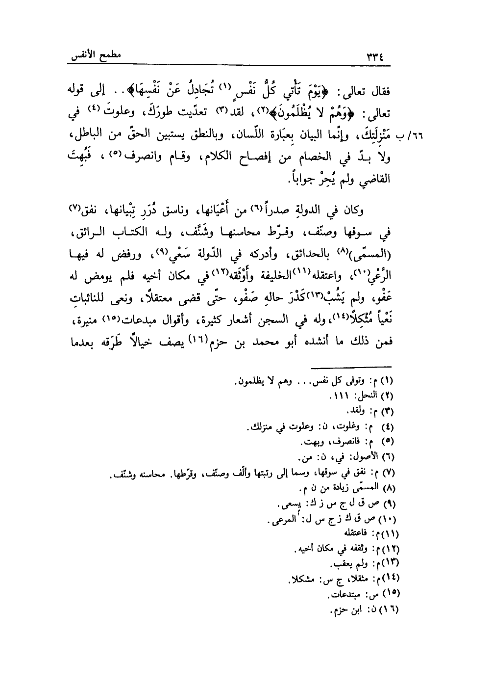 وكان في الدولة صدراً من أعيانها، وناسق دُرَرِ تِبيانها، نفق في سوقها وصنّف، وقرّط محاسنها وشَنَّف، وله الكتاب الرائق المُسمّى بالحدائق، وأدركه في الدّولة سَعي، ورفض له فيها الرَّعي، واعتقله الخليفة وأوثقه في مكان أخيه فلم يومض له عَفو، ولم يَشُب كَدر حالهِ صَفو، حتى قضى مُعتقلاً، ونعى للنائبات نَعياً مُثكِلاً، وله في السجن أشعار كثيرة، وأقوال ومبدعات منيرة، فمن ذلك ما أنشده أبو محمد بن حزم يصف خيالاً طَرقه بعدما