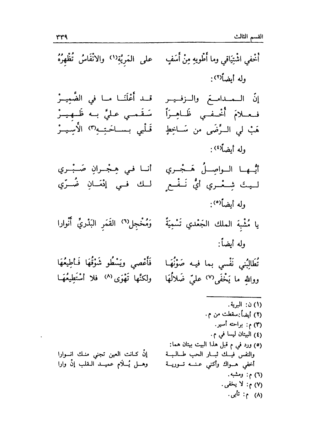 أخْفي اشْتِيَاقي وما أطويهِ مِنْ أسَفٍ ... على المَرِيَّةِ والأنفَاسُ تُظْهِرُهُ