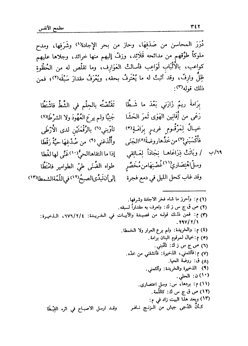 دُرر المحاسن من صَدفها، وحاز من بحر الإجادة وشرفِها، ومدح ملوكاً طوَّقهم من مدائحه قلائِد، وزفّ إليهم منها خرائد، وجلاها عليهم كواعب، بالألباب لَواعِب فأسالت العَوارِف، وما تقلّص له من الحُظوة ظِلٌ وارِفٌ، وقد أثبت له ما يُعترف بحقه، ويُعرف مقدار سَبقه، فمن ذلك قوله: