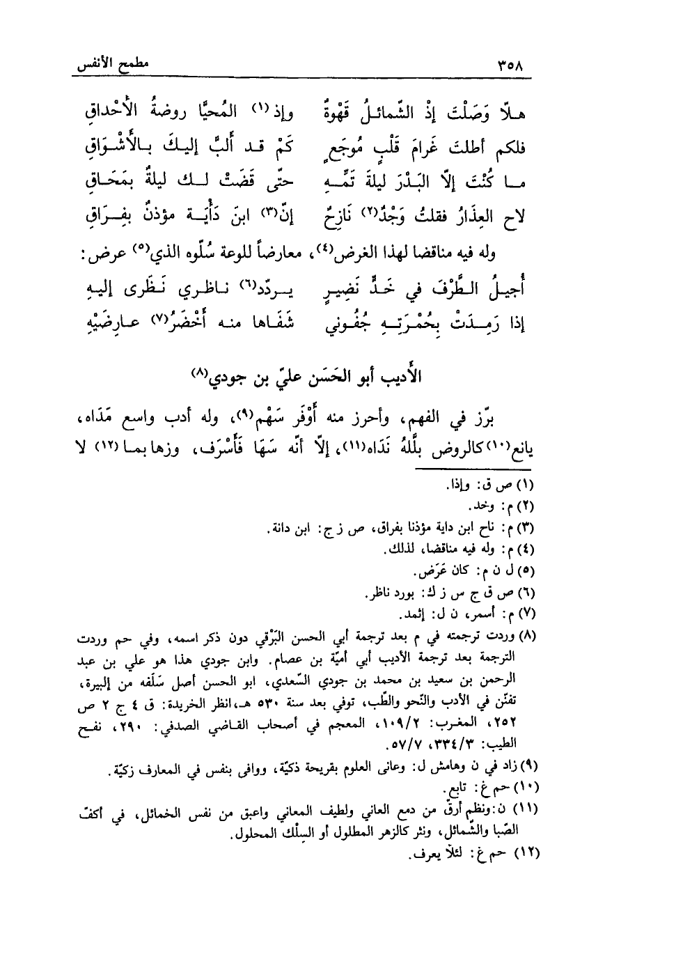 برّز في الفهم، وأحرز منه أوفر سَهم، وله أدب واسع مَداه، يانع كالروض بلَّلهُ نَداه، إلاّ أنه سَها فأسرَف، وزها بما لا