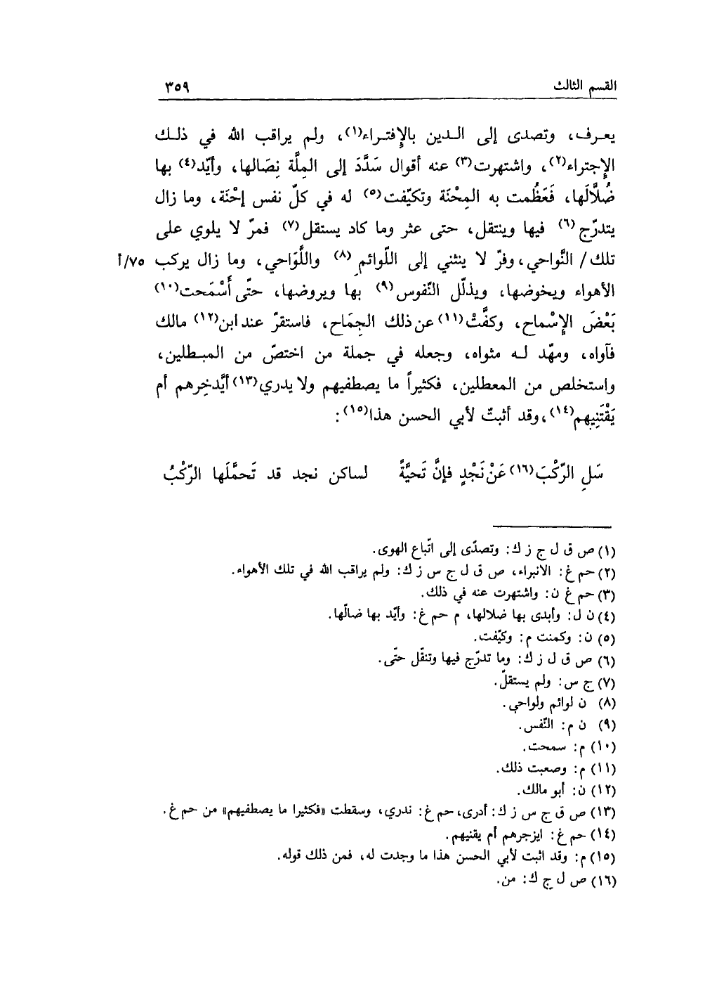 يعرف، وتصدى إلى الدين بالافتراء، ولم يراقب الله في ذلك الاجتراء، واشتهرت عنه أقوال سدَّدَ إلى المِلَّة نِصالها، وأيّد بها ضُلاَّلَها، فَعظُمت به المِحنة وتكيّفت له في كلّ نفس إحنة، وما زال يتدرّج فيها وينتقل، حتى عثر وما كاد يستقل فمرّ لا يلوي على تلك النَّواحي، وفرّ لا ينثني إلى اللّوائم واللَّواحي، وما زال يركب الأهواء ويخوضها، ويذلّل النّفوس بها ويروضها، حتى أسمحت بعض الإسماح، وكفَّت عن ذلك الجِماح، فاستقرّ عند ابن مالك فآواه، ومهّد له مثواه، وجعله في جملة من اختصّ من المبطلين، واستخلص من المعطلين، فكثيراً ما يصطفيهم ولا يدري أيَّدخِرهم أم يَقتنيهم، وقد أثبتّ لأبي الحسن هذا: