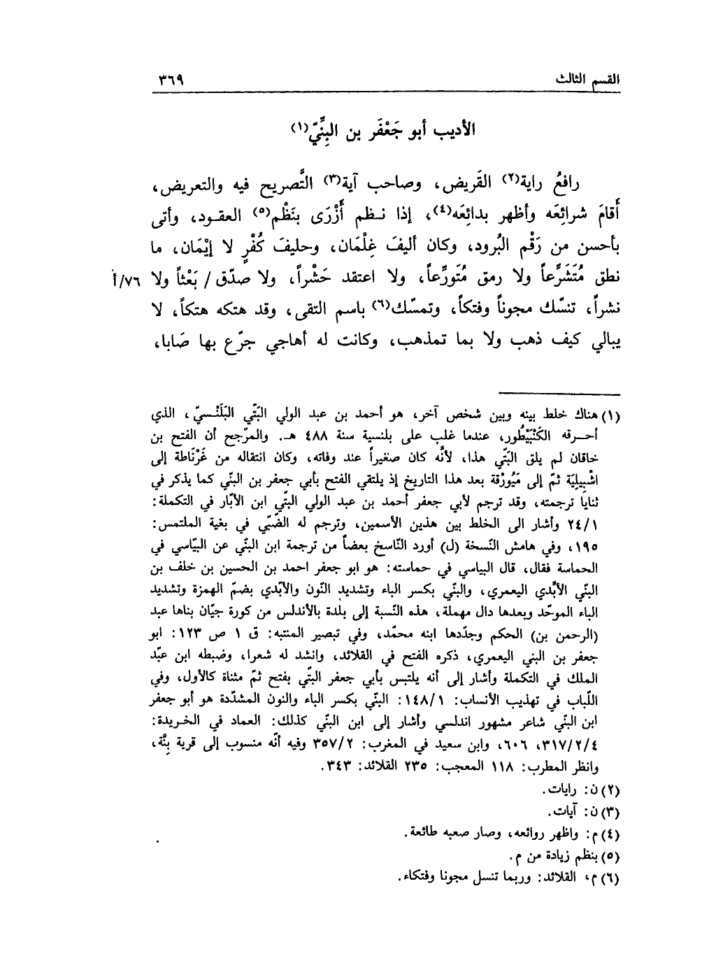 رافع راية القَريض، وصاحب آية التَّصريح فيه والتعريض، أثام شرائِعه وأظهر بدائِعه، إذا نظم أزرَى بنظم العقود، وأتى بأحسن من رَقم البُرود، وكان أليف غِلمان، وحليف كُفرٍ لا إيمان، ما نطق مُتشرِّعاً ولا رمق مُتورَِعاً، ولا اعتقد حَشراً، ولا صدّق بعثاً ولا نشراً، تنسّك مجوناً وفتكاً، وتمسّك باسم التقى، وقد هتكه هتكاً، لا يبالي كيف ذهب ولا بما تمذهب، وكانت له أهاجي جرّع بها صَابا،