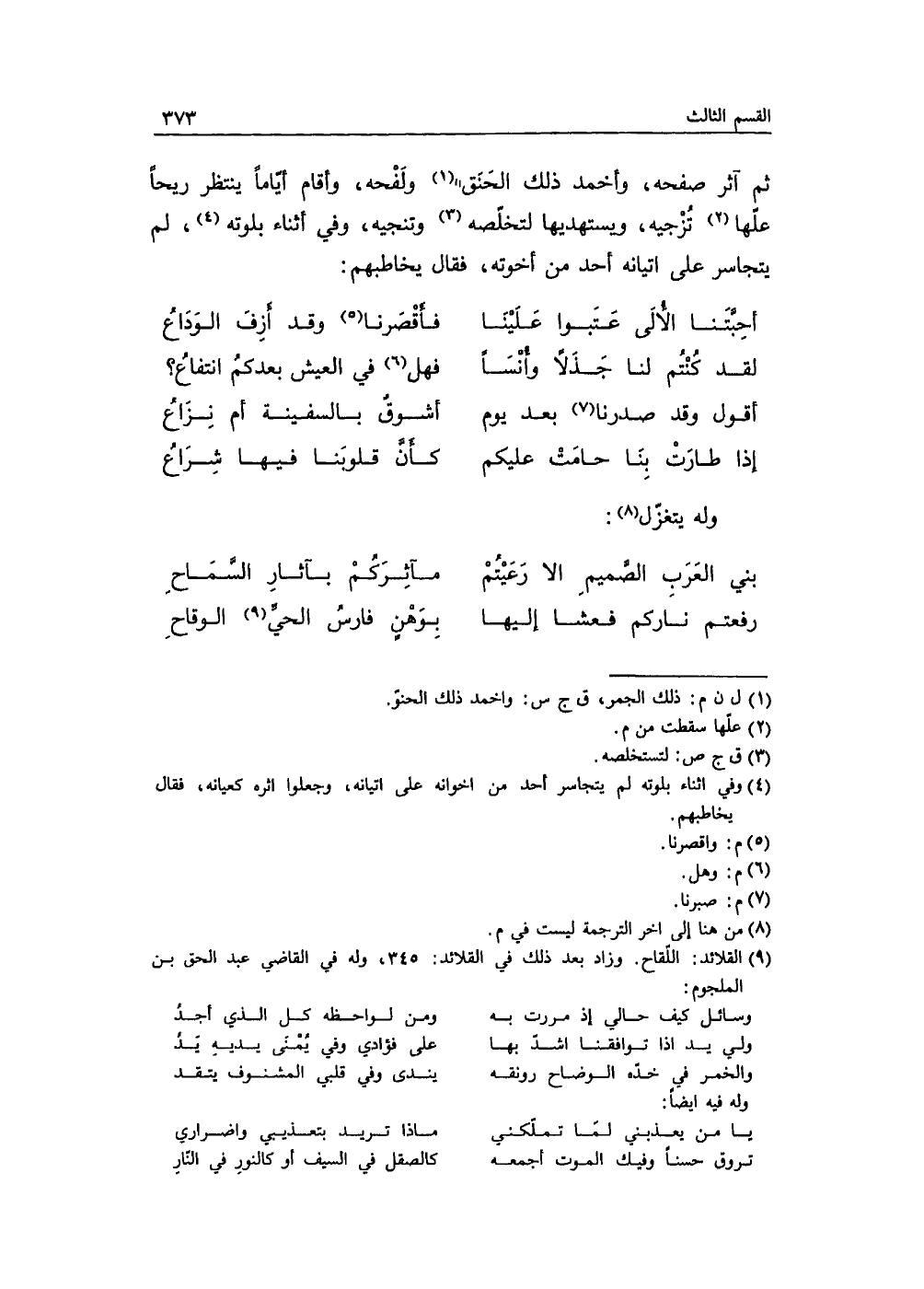 ثم آثر صفحه، وأخمد ذلك الحَنَق ولَفحه، وأقام أياماً ينتظر ريحاً علّها تُزجيه، ويستهديها لتخلّصه وتنجيه، وفي أثناء بلوته، لم يتجاسر على إتيانه أحد من إخوته، فقال يخاطبهم: