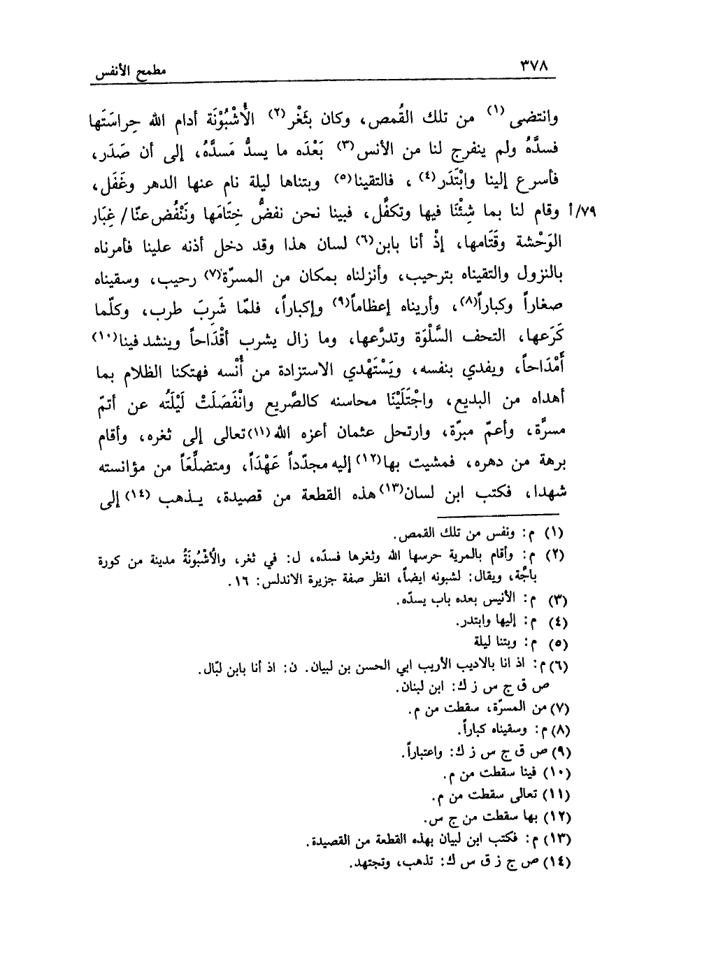 وانتضى من تلك القُمص، وكان بثَغر الأُشبُونة أدام الله حِراسَتها فسدَّهُ ولم ينفرج لنا من الأنس بَعدَه ما يسدُّ مَسدَّهُ، إلى أن صَدَر، فأسرع إلينا وابتدَر، فالتقينا وبتناها ليلة نام عنها الدهر وغَفَل، وقام لنا بما شِئنَا فيها وتكفَّل، فبينا نحن نفضُّ خِتامَها ونَنفُض عنّا غِبَار الوَحشة وقَتَامها، إذ أنا بابن لسان هذا وقد دخل أذنه علينا فأمرناه بالنزول والتقيناه بترحيب، وأنزلناه بمكان من المسرّة رحيب، وسقيناه صغاراً وكباراً، وأريناه إعظاماً وإكباراً، فلمّا شَرب طرب، وكلّما كَرَعها،