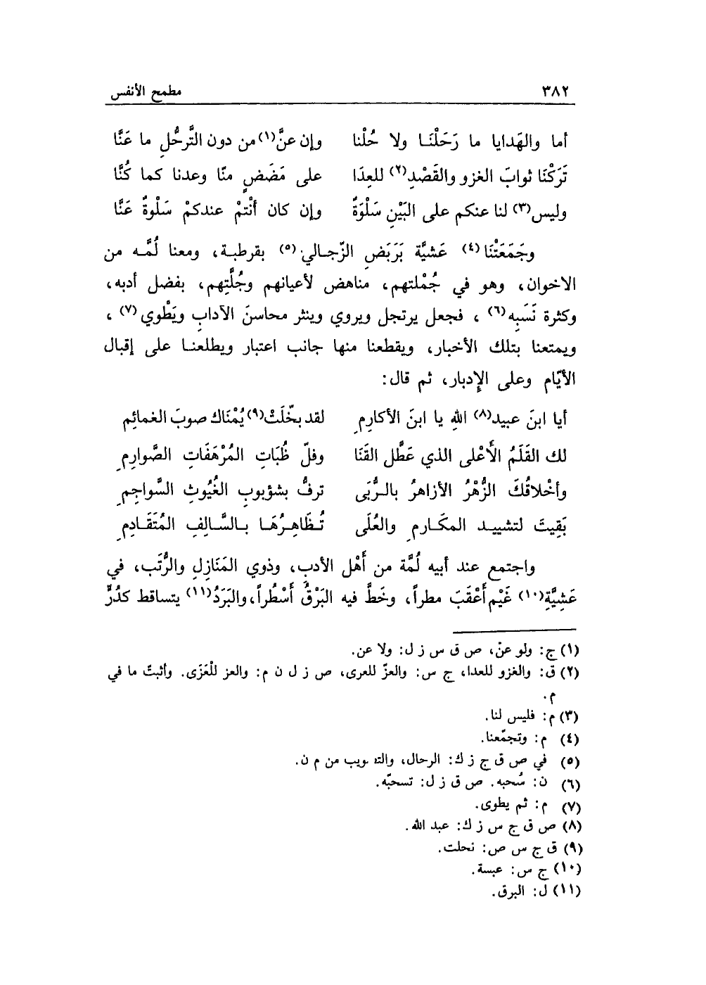 وجَمعتَنا عَشيَّة بَربَض الزّجالي بقُرطبة، ومعنا لُمَّه من الأخوان، وهو في جُملتهم، مناهض لأعيانهم وجُلَّتِهم، بفضل أدبه، وكثرة نَسبه، فجعل يرتجل ويروي وينثر محاسن الآداب ويَطوي، ويمتعنا بتلك الأخبار، ويقطعنا منها جانب اعتبار ويطلعنا على إقبال الأيّام وعلى الإدبار، ثم قال: