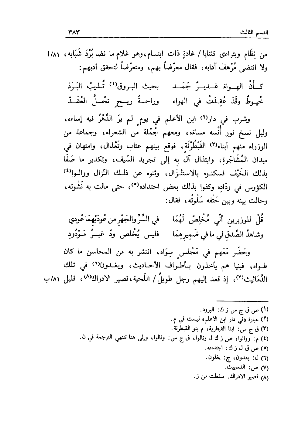 كدُرٍّ من نِظَام ويتراءى كثنايا غادةٍ ذات ابتسام، وهو غلام ما نضا بُردَ شَبابه، ولا انتضى مُرهف آدابه، فقال معرّضاً بهم، ومتعرّضاً لتحقق أدبهم: