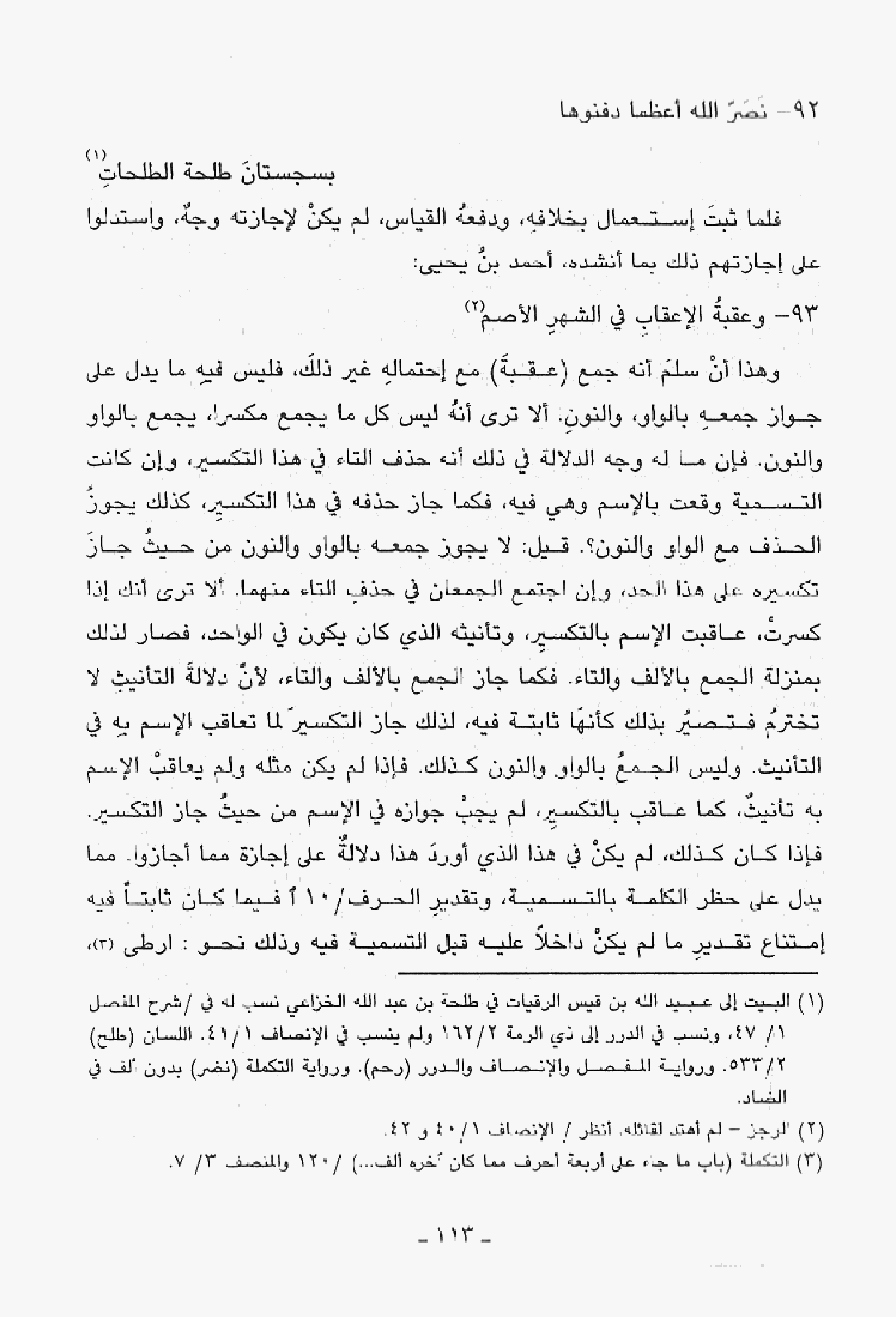 هذا أن سلم أنه جمع (عقبة) مع إحتماله غير ذلك، فليس فيه ما يدل على جواز جمعه بالواو، والنون. ألا ترى أنه ليس كل ما يجمع مكسرا، يجمع بالواو والنون. فإن ما له وجه الدلالة في ذلك أنه حذف التاء في هذا التكسير، وإن كانت التسمية وقعت بالإسم وهي فيه، فكما جاز حذفه في هذا التكسير، كذلك يجوز الحذف مع الواو والنون؟. قيل: لا يجوز جمعه بالواو والنون من حيث جاز تكسيره على هذا الحد، وإن اجتمع الجمعان في حذف التاء منهما. ألا ترى أنك إذا كسرت، عاقبت الإسم بالتكسير، وتأنيثه الذي كان يكون في الواحد، فصار لذلك بمنزلة الجمع بالألف والتاء. فكما جاز الجمع بالألف والتاء، لأنَّ دلالة التأنيث لا تخترم فتصير بذلك كأنها ثابتة فيه، لذلك جاز التكسير لما تعاقب الإسم به في التأنيث. وليس الجمع بالواو والنون كذلك. فإذا لم يكن مثله ولم يعاقب الإسم به تأنيث، كما عاقب بالتكسير، لم يجب جوازه في الإسم من حيث جاز التكسير. فإذا كان كذلك، لم يكن في هذا الذي أورد هذا دلالة على إجازة مما أجازوا. مما يدل على حظر الكلمة بالتسمية، وتقدير الحرف/ 10 آفيما كان ثابتًا فيه إمتناع تقدير ما لم يكن داخلاً عليه قبل التسمية فيه وذلك نحو: ارطى،