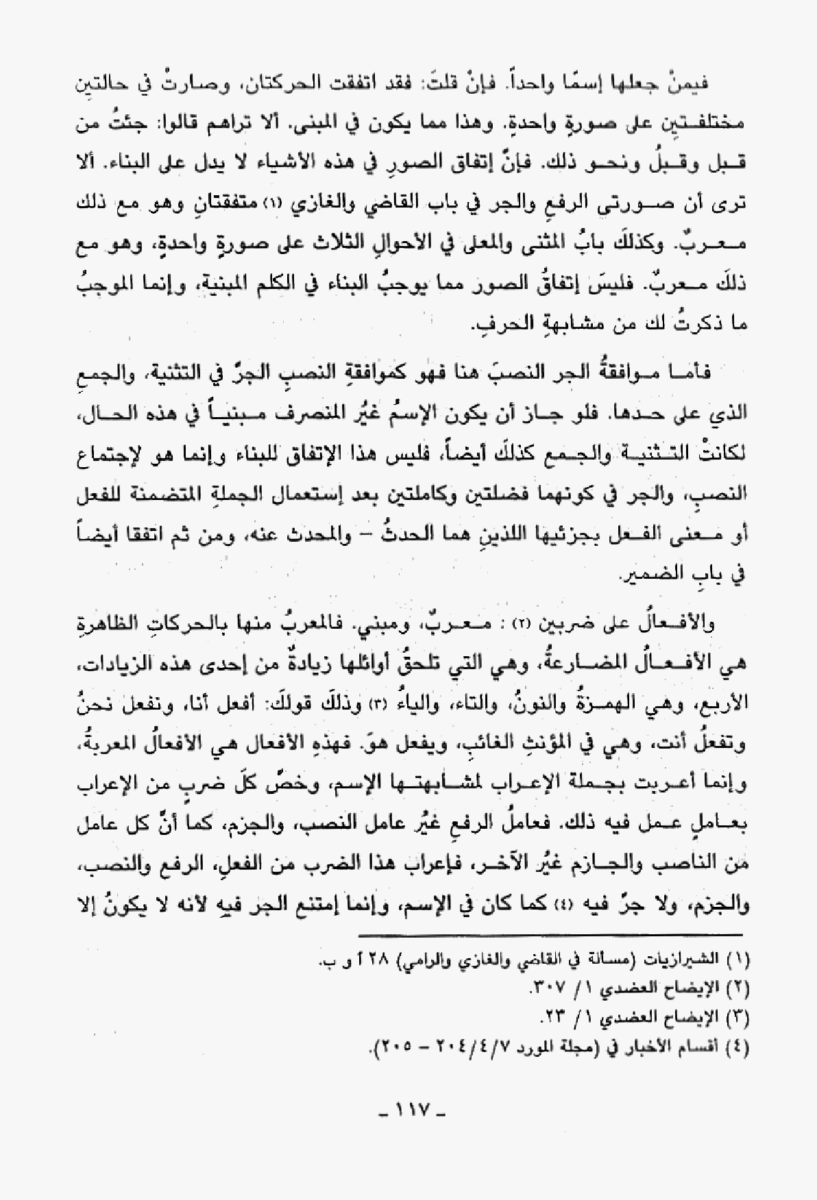 فأما موافقة الجر النصب هنا فهو كموافقة النصب الجرّ في التثنية، والجمع الذي على حدها. فلو جاز أن يكون الإسم غير المنصرف مبنيًا في هذه الحال، لكانت التثنية والجمع كذلك أيضًا، فليس هذا الإتفاق للبناء وإنما هو لإجتماع النصب، والجر في كونهما فضلتين وكاملتين بعد استعمال الجملة المتضمنة للفعل أو معنى الفعل بجزئيها اللذين هما الحدث - والمحدث عنه، ومن ثم اتفقا أيضًا في باب الضمير.