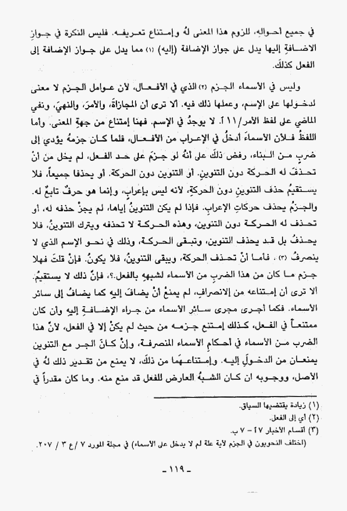 وليس في الأسماء الجزم الذي في الأفعال، لأن عوامل الجزم لا معنى لدخولها على الإسم، وعملها ذلك فيه. ألا ترى أن المجازاة، والأمر، والنهي، ونفي الماضي على لفظ الأمر /11 آ. لا يوجد في الإسم. فهنا إمتناع من جهة المعنى. وأما اللفظ فلأن الأسماء أدخل في الإعراب من الأفعال، فلما كان جزمه يؤدي إلى ضرب من البناء، رفض ذلك على أنه لو جزم على حد الفعل، لم يخل من أن تحذف له الحركة دون التنوين. أو التنوين دون الحركة. أو يحذفا جميعًا، فلا يستقيم حذف التنوين دون الحركة، لأنه ليس بإعراب، وإنما هو حرف تابع له. والجزم يحذف حركات الإعراب. فإذا لم يكن التنوين إياها، لم يجز حذفه له، أو تحذف له الحركة دون التنوين، وهذه الحركة لا تحذفه ويترك التنوين، فلا يحذف بل قد يحذف التنوين، وتبقى الحركة، وذلك في نحو الإسم الذي لا ينصرف، فأما أن تحذف الحركة، ويبقى التنوين، فلا يكون. فإن قلت فهلا جزم ما كان من هذا الضرب من الأسماء لشبهه بالفعل.؟، فإنَّ ذلك لا يستقيم. ألا ترى أن إمتناعه من الانصراف، لم يمنع أن يضاف إليه كما يضاف إلى سائر الأسماء. فكما أجرى مجرى سائر الأسماء من جراء الإضافة إليه وأن كان ممتنعًا في الفعل، كذلك إمتنع جزمه من حيث لم يكن إلا في الفعل، لأنَّ هذا الضرب من الأسماء في أحكام الأسماء المنصرفة، وإن كان الجر مع التنوين يمنعان من الدخول إليه. وإمتناعهما من ذلك، لا يمنع من تقدير ذلك له في الأصل، ووجوبه أن كان الشبه العارض للفعل قد منع منه. وما كان مقدرًا في